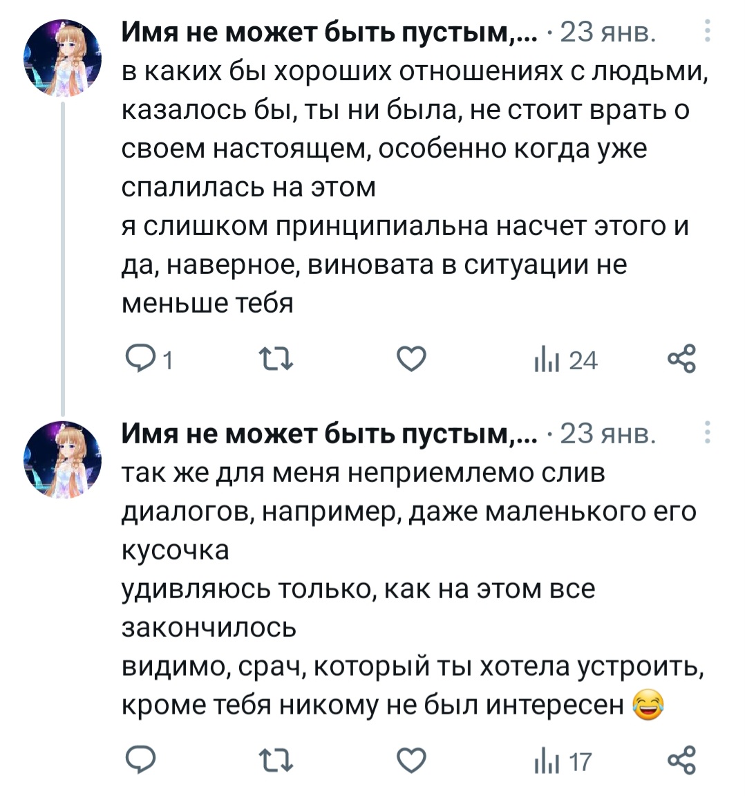 >>69459 Ты б хоть ники замазала, а вообще спросила бы в этом самом твиттере у нее лично, а не приносила свои говноскрины сюда. Как будто больше нечего обсуждать по теме.