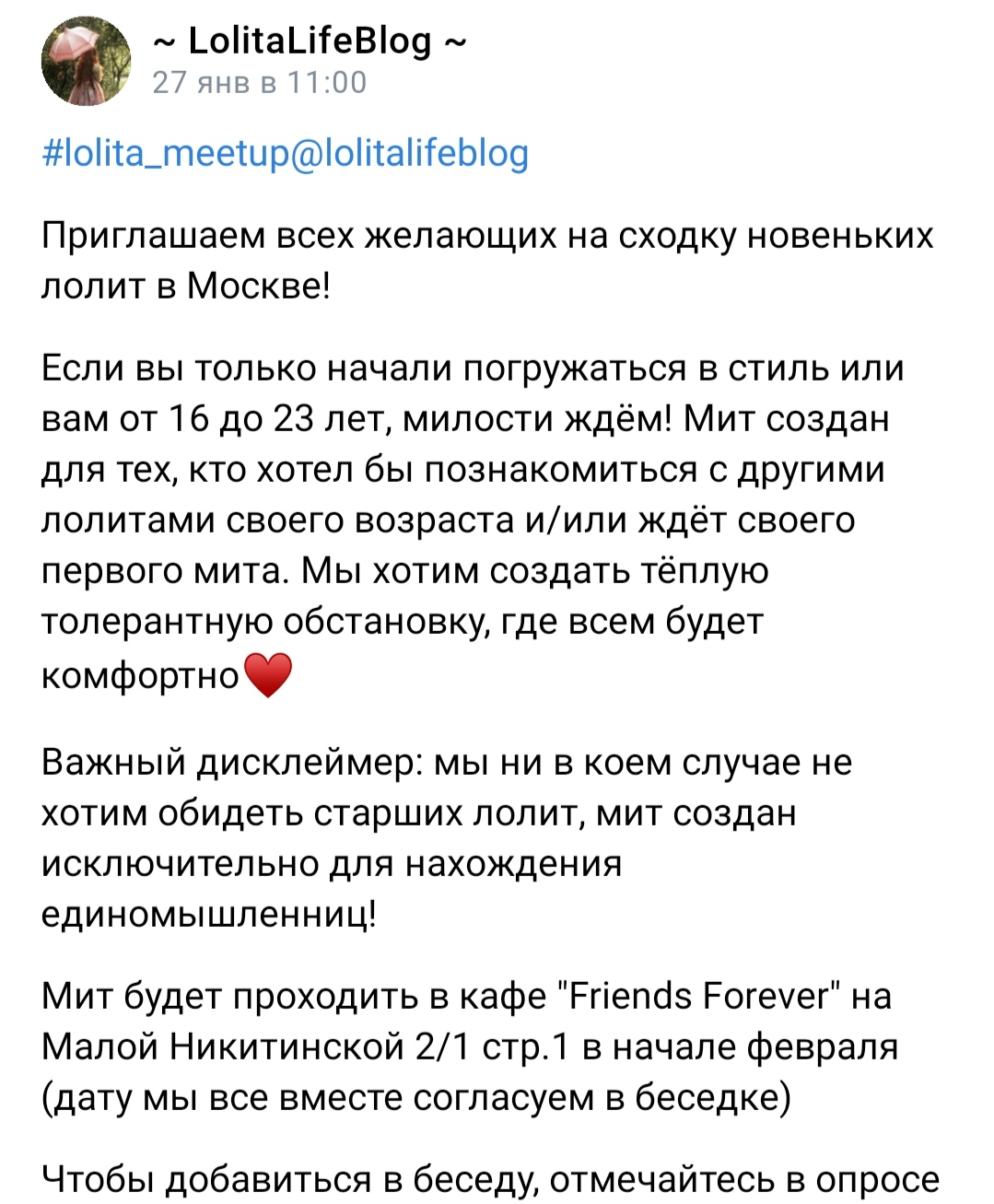 >>69831 А мне жаль, что в мою начинашкинскую пору такого не было. На наш первый локальный мит для знакомства к куче вчерашних школьниц и школьниц приперлась "гура стиля" под 30 с таким видом, будто её силком заставили. Пассивно-агрессивно отгавкивалась на попытки познакомится, а после встречи ещё и буллила некоторых участниц в интернете. И это при том, что все с самого начала видели, что это встреча начинах, которые ещё даже не в стиле толком. Потом конечно всё равно все перезнакомились и собирались уже без неё, но осадочек от "первого лолитного мита" запомнился. Конечно ебанутость от возраста не зависит, и далеко не всех кризис 30 превращает в злобных мегер, но когда ты ещё совсем молод, большая разница, противостоит ли тебе неадекватный ровесник, или неадекватный взрослый. Так что если хотят создать себе безопасный мит только для молодых и начинающих, то и молодцы.
