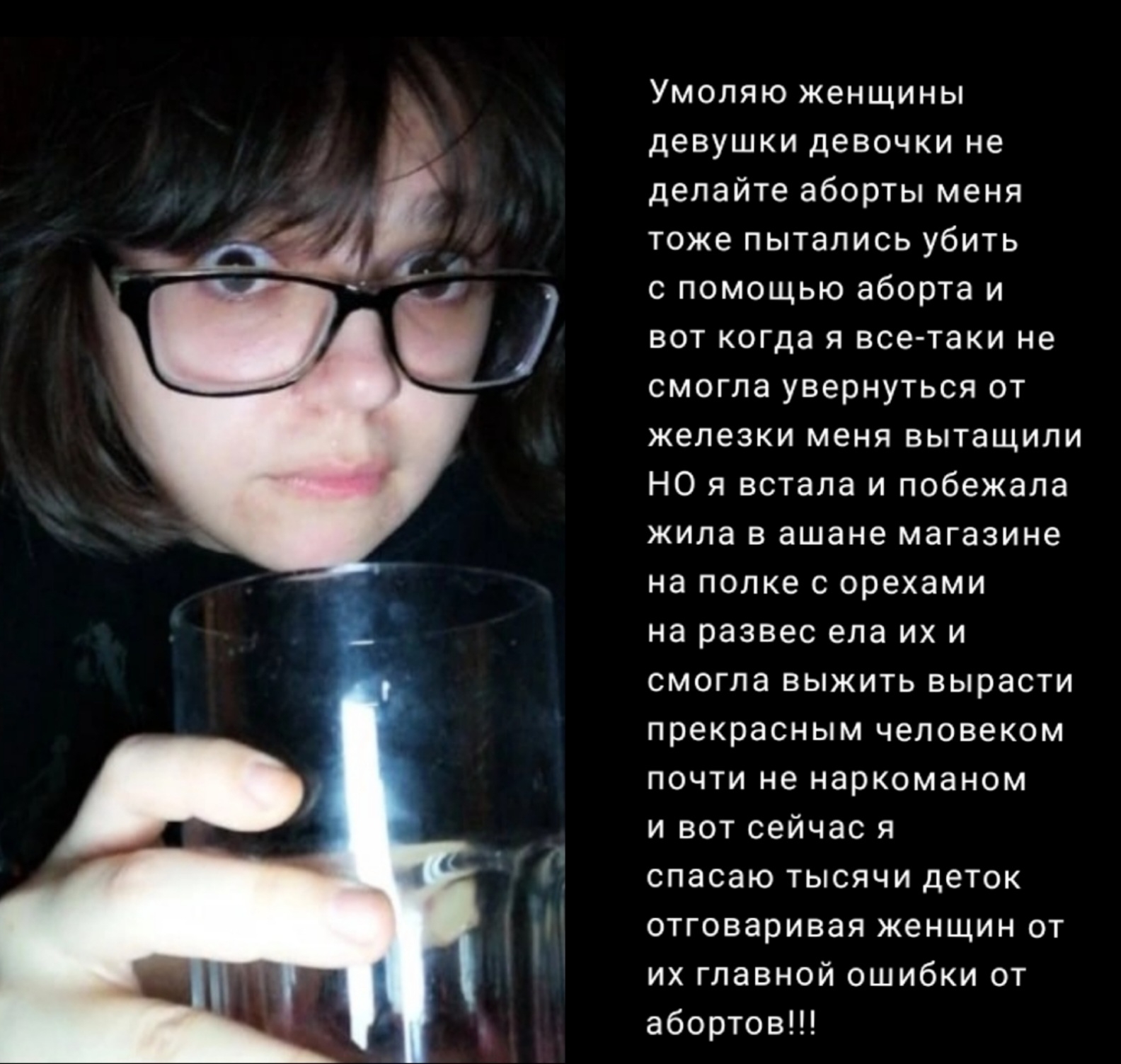 >>70226 Однажды я обнаружила, что забеременела и испугалась, что теперь буду толстая, боялась буллинга на двачике, что не будут пускать на миты, и поэтому пошла на этот шаг. Да, я сделала оборот, но все равно разжирела и чтобы злые лолиты меня не обсирали, я первая напала и теперь меня все боятся!!! Но меня гложит совесть, за убитого ребеночка, я мечтаю вернутся в тот день и сказать ему "я тебя не брошу" и когда увидела это признание, то я подумала, а вдруг это мой ребеночек, моя доченька??? Прости меня, милая, надеюсь ты сможешь простить!!! плачу