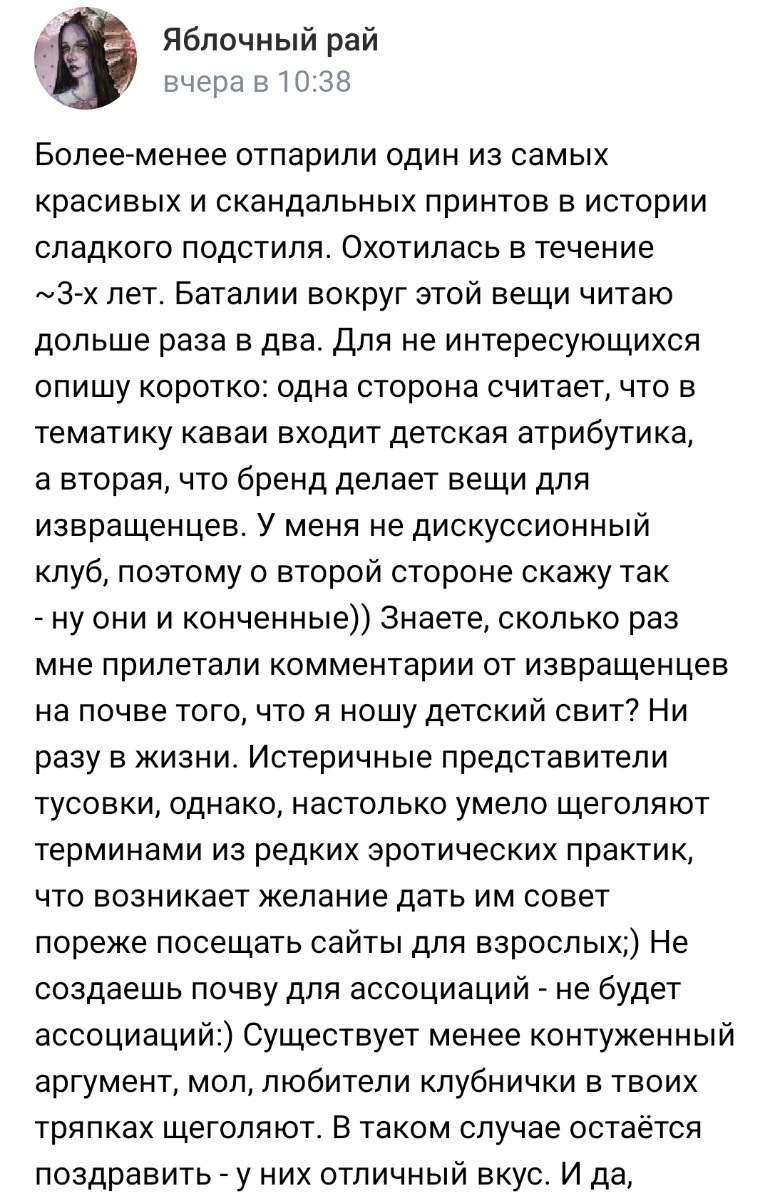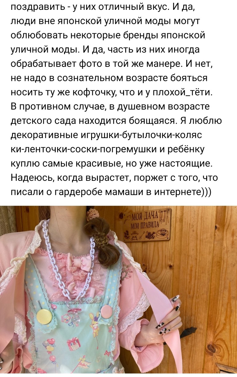 Сисы, хоть убейте – не понимаю прикола жаловаться на травлю в лб. Я в стиле совсем недавно; когда только прощупывала почву, там долго зависала и читала комментарии. И обоже, каких-то конкретных помоев вообще не увидела, наоборот, всë спокойно, советов много (дельных и не очень гыгыгы). Типа, камон, в этих ваших интернетах (и не только) в любой интересующей тебя сфере могут ужасно обосрать, везде есть токсики, и везде можно облажаться и получить заслуженную критику. А когда советуют погладить платье без перехода на личности, но у тебя случается истерика по этому поводу, наверное, проблема не в соо Пикрил рандом
