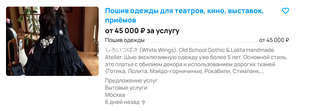 >>70969 Барахолку почистили, так что можно на авито глянуть объявления в духе " "каловое платье с Али за косарь" цена 4 тыщи" и в описании оправдание "ой такая цена из-за доставки" или "самодельный хеддресс из говна и палок" цена косарь "не бейте, материалы дорого стоили" Материалы – упаковочная лента три метра за 100 и кружево,срезанное с бабушкиной клеëнки