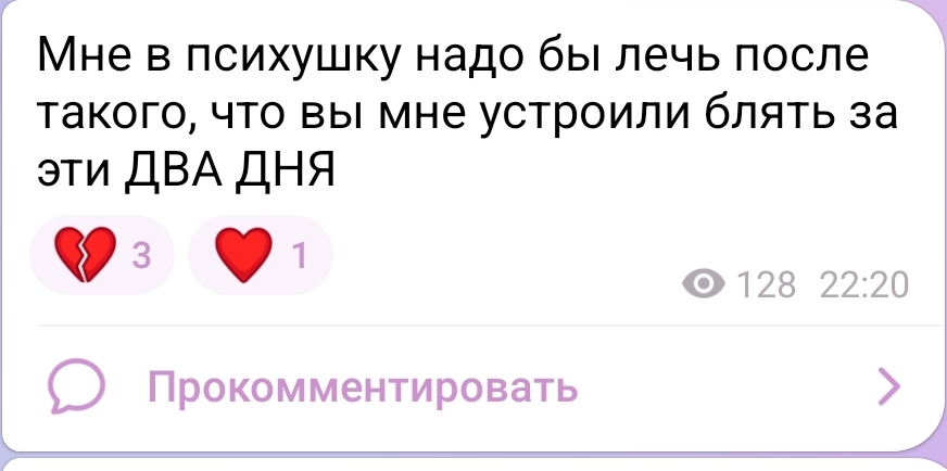 >>71083 Проблема не в публичном сраче, а в срыве человека до него. Срыв не из ничего произошел. На канале было написано, что и почему бесит инфант. Я сюда не мегаплей обсуждать пришла. У меня подгорело, какие вещи писали инфант и об инфант. В телеграмме ее был пост, где ее как продавца обматерил даже не покупатель. Скринов нет, но прошу принести. Если это удалено. Я такой норме поведения в соо не рада. А у этих комментарующих никаких срывов нет.