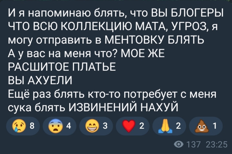 один мат в сторону мегаплей >> несколько дней выебок ее других подружек и подписчиков в личку чела, который им максимум задел их стремную мораль, где шмотки стоят выше человека, понимаю, сиса, понимаю даже если б платья были ДЕЙСТВИТЕЛЬНО(( В ужасном состоянии, это можно было обсосать в узком кругу, без проблем для объекта вашего внимания, я сама бешусь когда вижу перешивки, но такую хуйню устраивать это маразм блять, ее собственность, жду когда реально трусы себе сошьет а те, кто считает по-другому, желаю полечить голову, все, че вы можете сделать это поржать над нервным срывом другого человека и злорадствовать, кек, а инфант, в то же время, этот тред одним своим существованием создала и продолжает его разъебывать)))