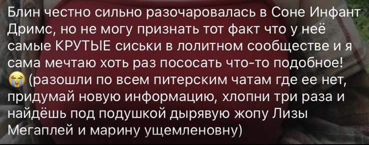 И потом дорогая тиктокерша пошла в свой телеграмм канал расписывать, как ее ужасно оскорбили, когда она свою подружку отхуесосила за спиной, а на вопрос с какого хуя предложила ей придти в беседу к 50 заранее настроенным против нее людям и доказывать, что та хуйня, которую она высрала неправда))))у инфант возможности высказаться тупо не было, я прекрасно верю и в угрозы, и в оскорбления и в прочее, да да, конечно, давайте делать вид что это не так, все видели как минимум ту стремную тетку в беседе, в то время как инфант что марине что вебкам тян писала положительные комменты, да еще и рекламила по доброте душевной канал первой, ну и дура ебать