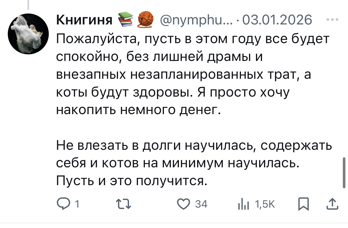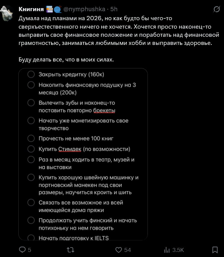 >>79658 Она, вроде, столько нонфикшена читает, живет уже плюс/минус самостоятельно, а цели у нее максимально не реалистичные для ее уровня жизни. Работает за 60к, но при этом хочет откладывать подушку, хочет новый рот (ты в курсе сколько это стоит?), стимдек, какие-то затраты на максимальные юзлесс хобби типа швейной машинки. Стоит ли говорить, что в конце 26 года будет полная фрустрация от нереализованности? Зато траву курит и под накуркой инсайты получает.