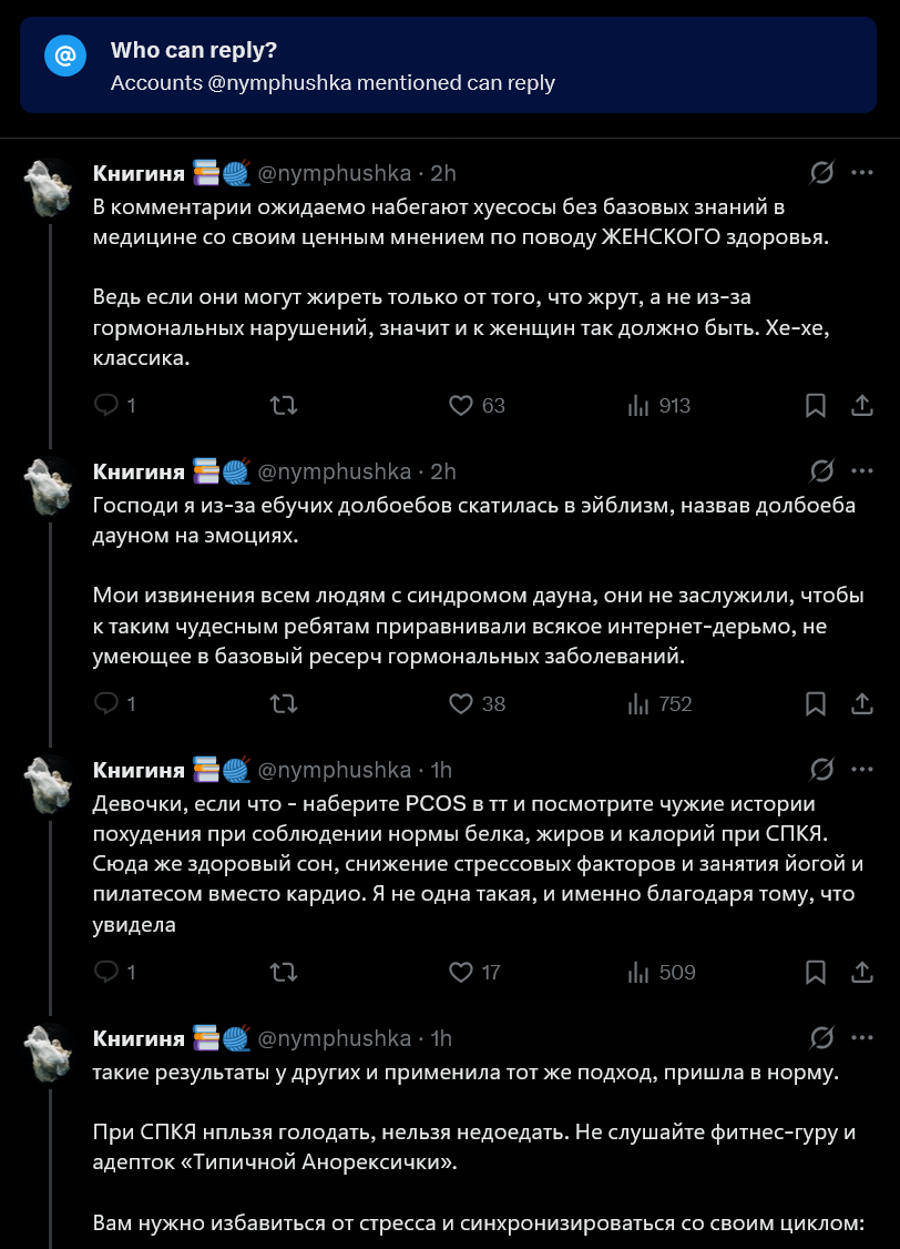 Кто помнит эту сущность, она же сама самосдеанонилась в Твиттере https://x.com/nymphushka Ведёт нормисную жизнь, но, судя по постам, ситуация ее ничему не научила