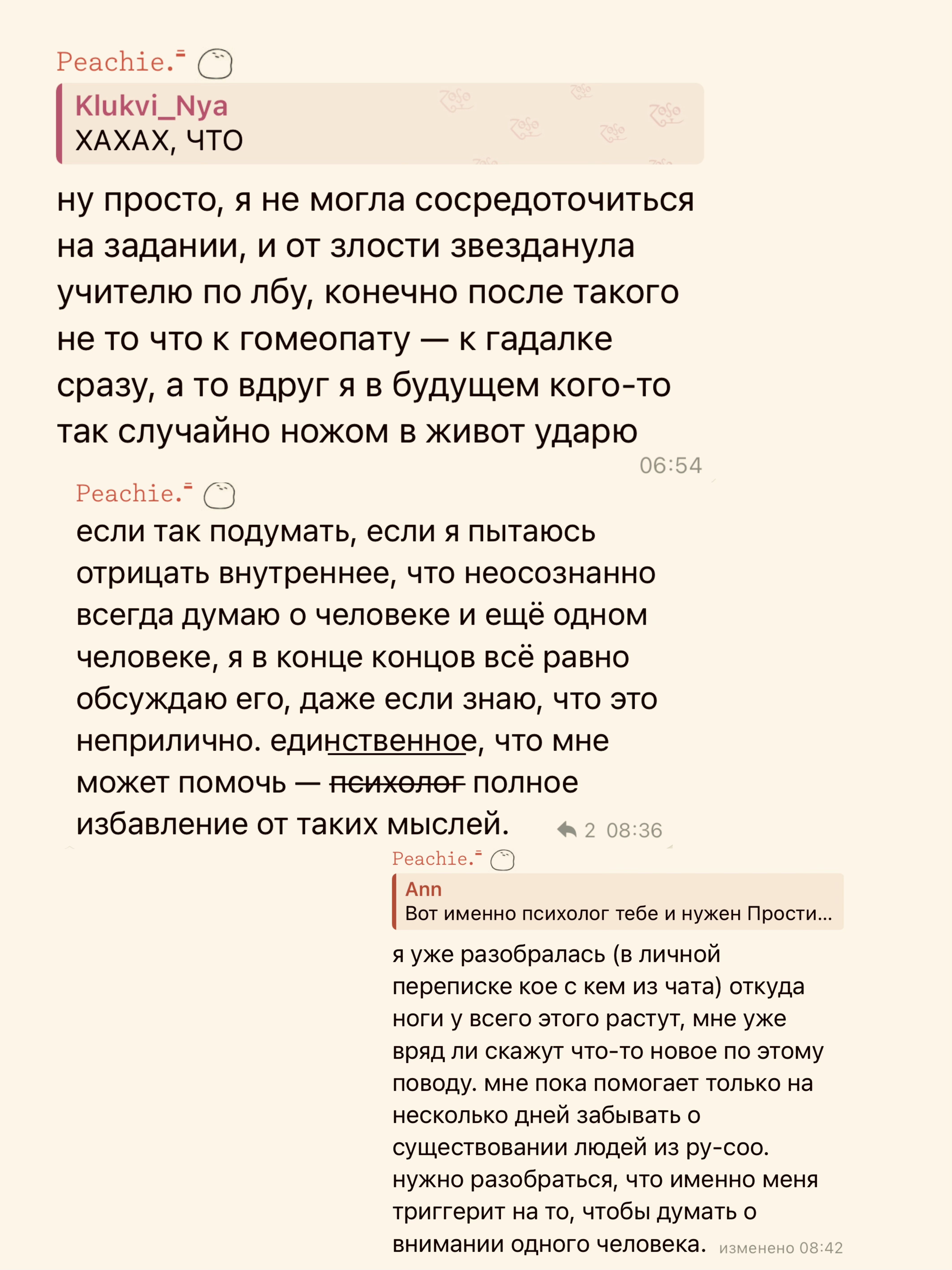 >>73630 Это происходит не только в голове у наннара, могу изи вспомнить монологи пичи в публичных чатах, где она рассказывает про свои обсессии на фая и наннара, о том что у нее припадки ярости и она ударила препода и прочее Ее за это забанили в нескольких чатах если что, так что очевидцы были