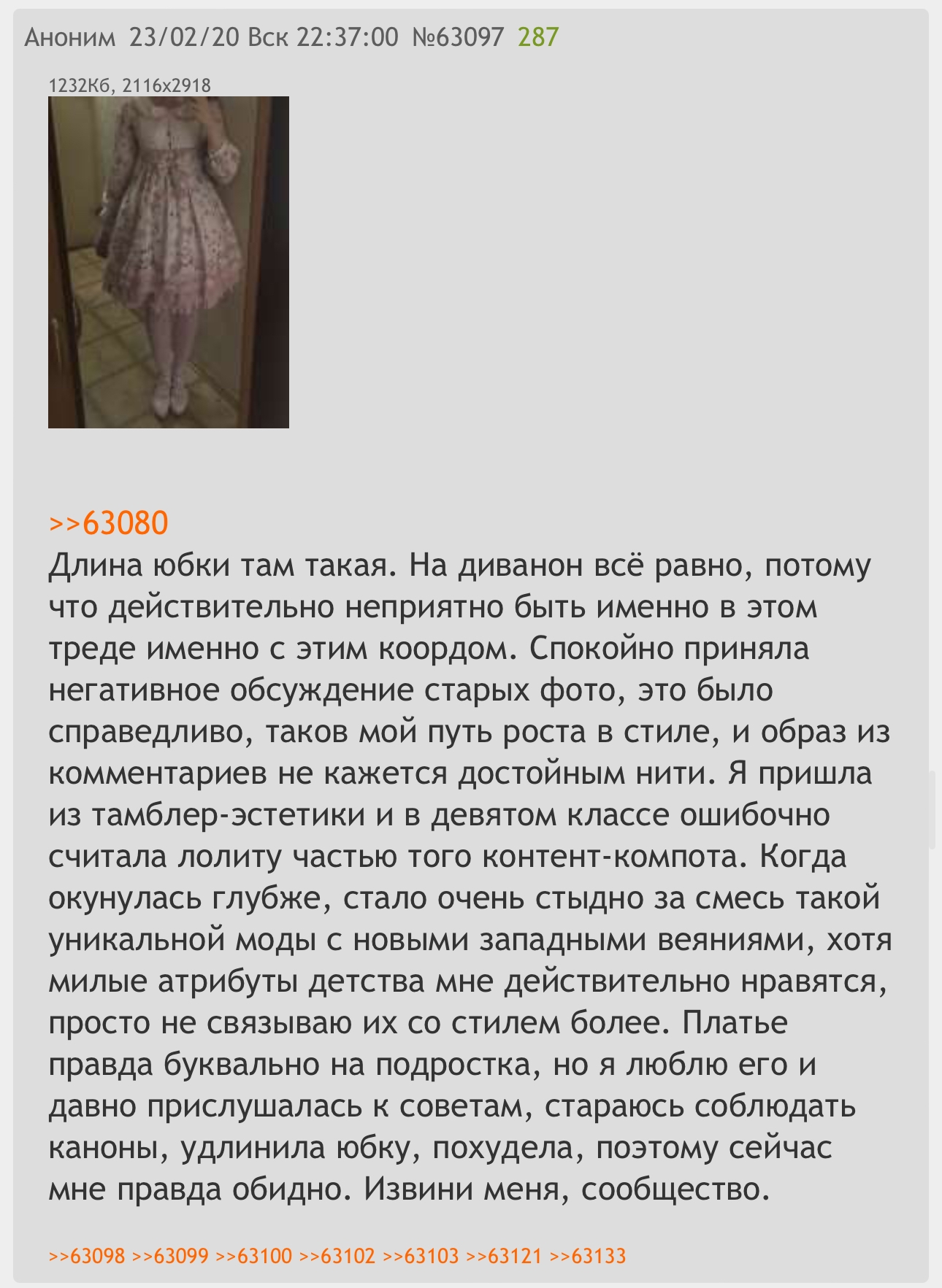 >>74493 это выше написали, но вообще логично есть еще причины, по которым лолита никогда не фотографирует одежду на себе, но при этом активно участвует в жизни сообщества и собирает коорды на полу? некоторые скрывают лица для анонимности, но это не тот случай очевидно да и переход на тао и более современные вещи исключительно с олдскула, в котором так и ни одного образа не было выставлено