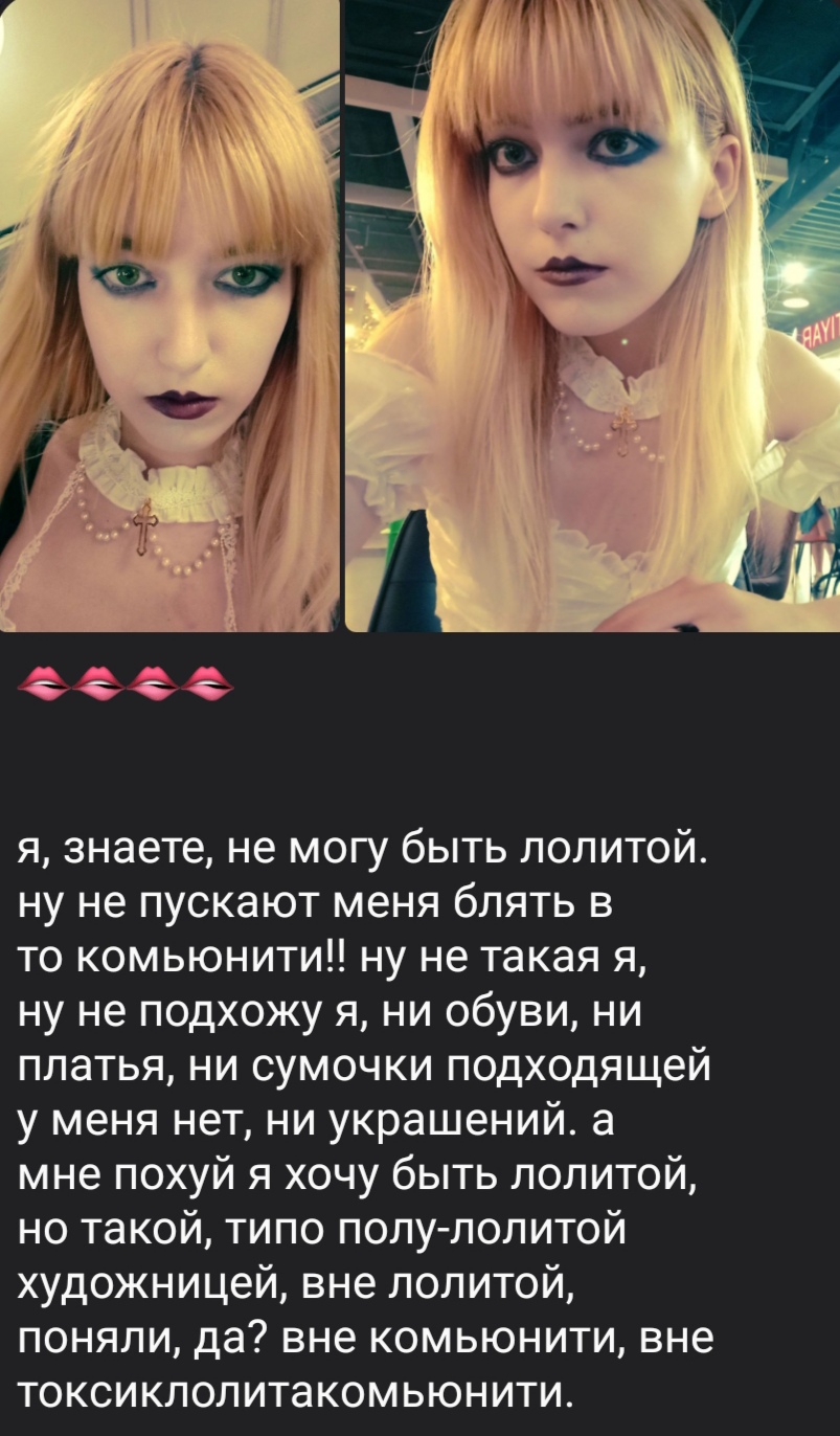 >>73755 И купленное барахло с авито из некопошопа)) Ни одного лолитного полного образа, как она, у нас пол кампуса ходят, типичные девочки альтушки/готки- неформалки Не понимаю, почему нельзя составить нормальный хотя бы 1 полноценный лолитный коорд, не из тряпок цивильных или анимешных, сейчас возможности заказать бюджетное платье и акссы есть, вся информация о стиле/канонах в открытом доступе Так что мешает этим недололитам?