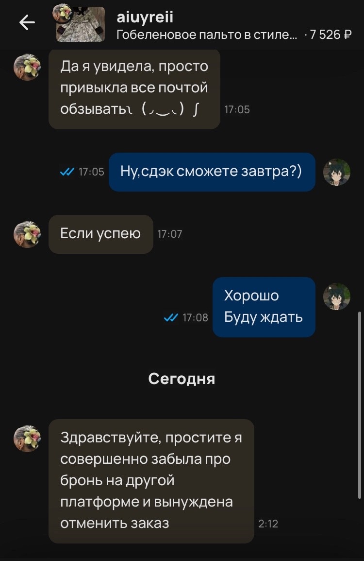 >>74511 от vm, гобеленовое, по дешевке за 7к, прикол в том, что она ей и подруга писала, прям сразу почти после публикации, продаванка была в сети, но не отвечала, очень мутная короче, с предоплатой ни в коем случае не покупайте у нее фото из ее фидбека