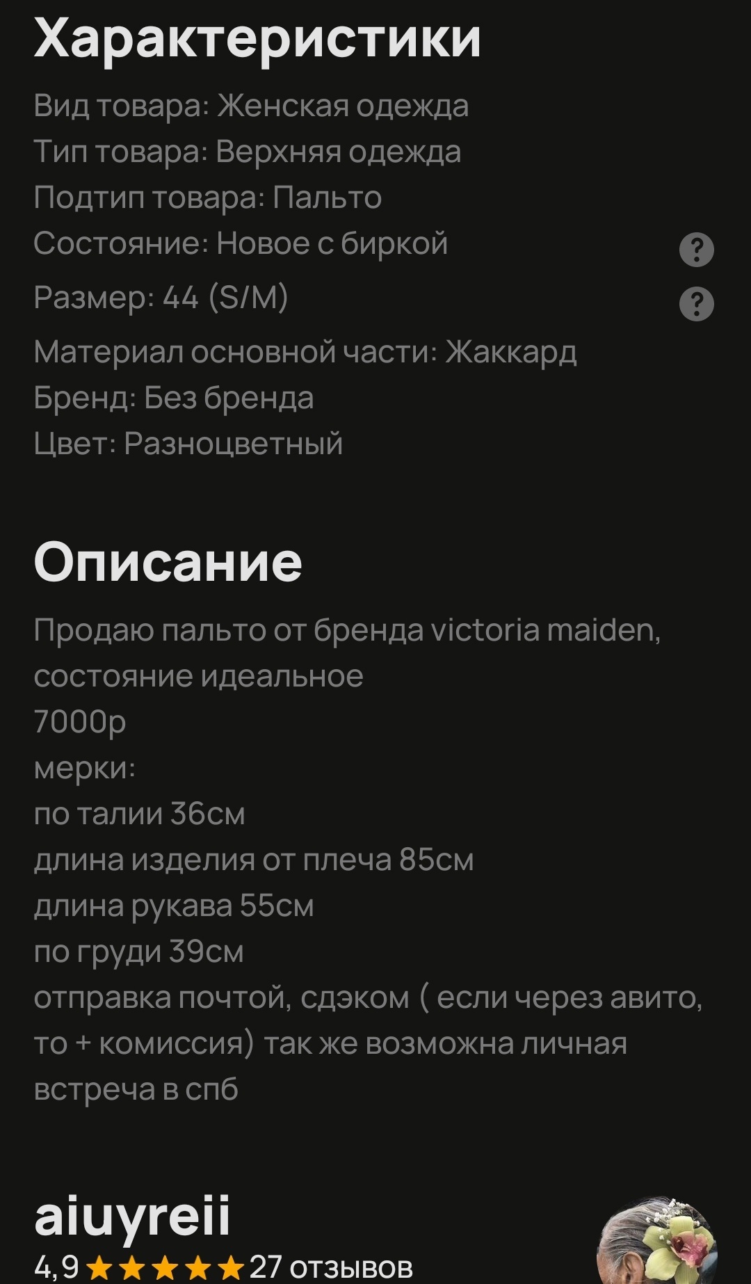 >>74518 Читай: victoria maiden, не victorian. В вк было четко прописано, что реплика, а на авито за такое банят объявления сразу же. Мне кажется, в объявлении ещё и фото бирки есть)))