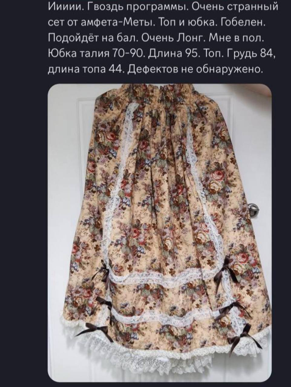 >>74593 Мне достался раритетный ап с авито за 3к, написано было платье для выпускного, я думала пришлют реплику или говно какое-то вместо ап, но нет, ориг , без следов носки и бирками в пакете))))