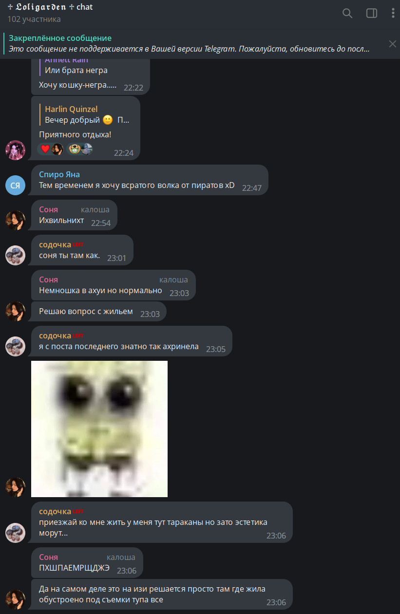 >>75092 Её потом кикнули, из-за чего в других чатах она активно жаловалась на токсичных лолит (кст они с бобилайнихой сдружились походу). Из других чатов её тоже повыкидывали Но в садике ей комфортно, там любят убогих