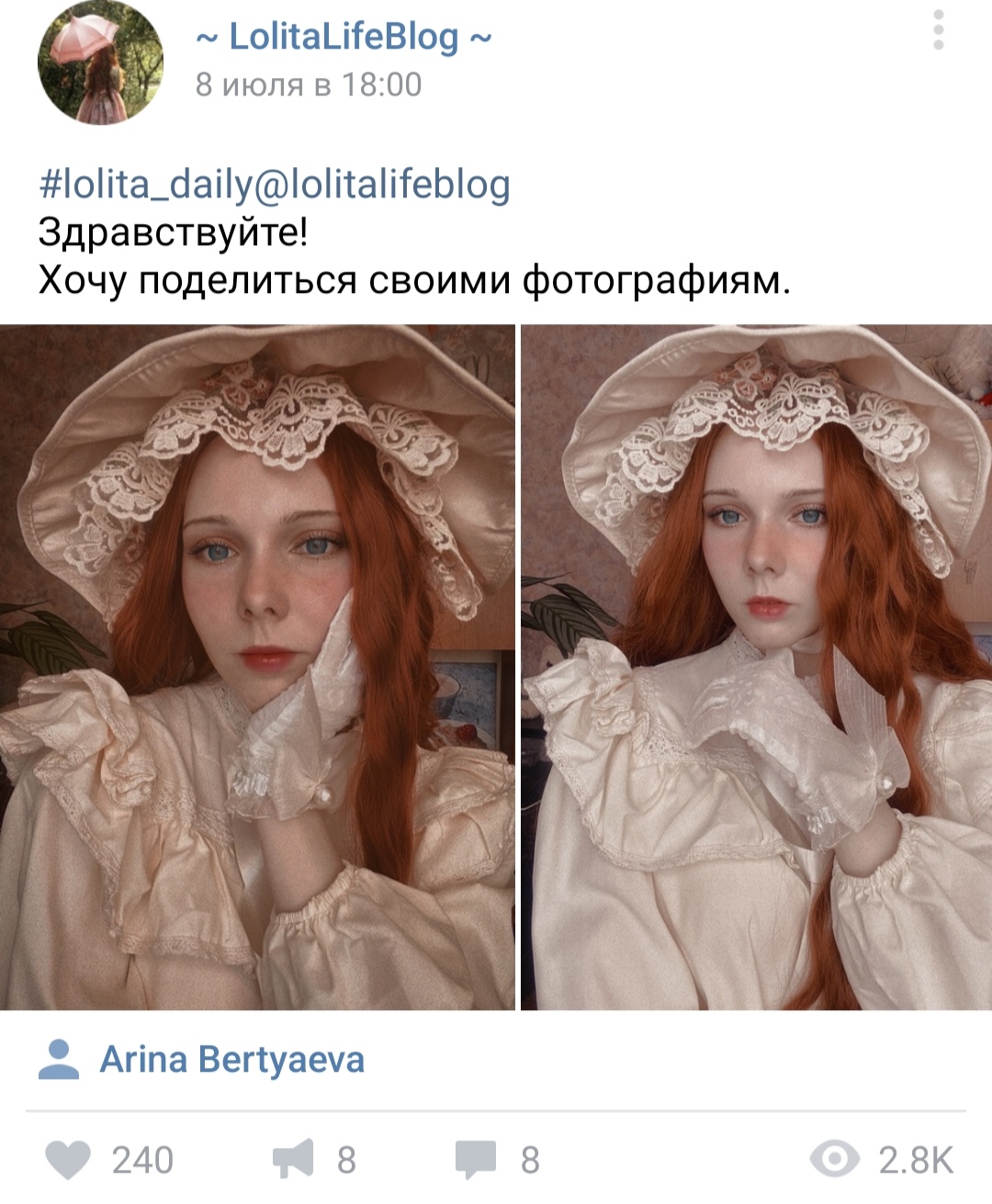 >>74818 Сосиска, я бы тот пост не принесла, будь та тян реально лолитой. Посты с кусками лолитной одежды в ллб не лайкаю, но против ничего не имею. Тут же вообще залетная скидывает портретную фотку, силуэта ведь у неё нужного нет, а внимания хочется