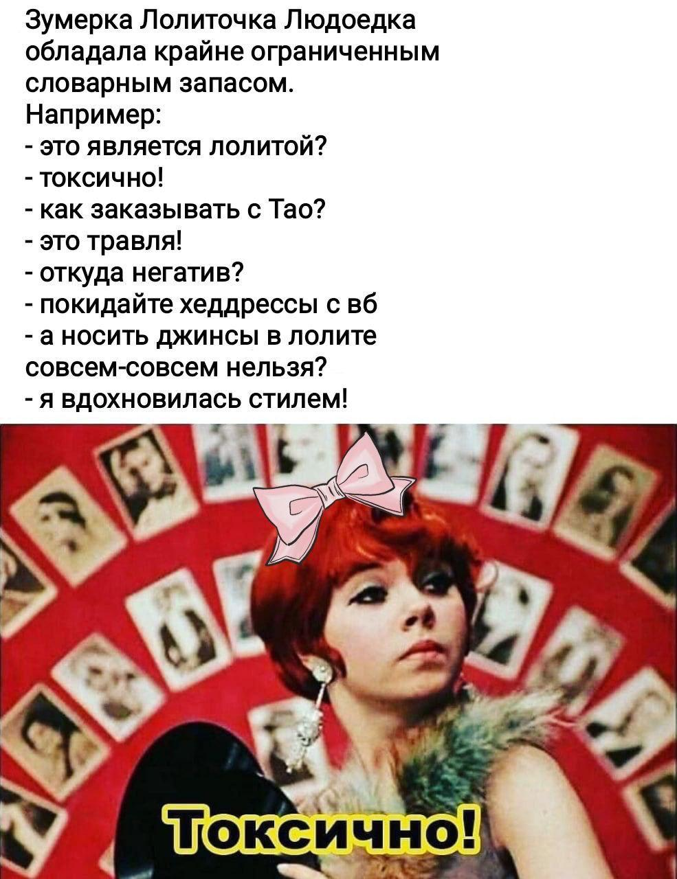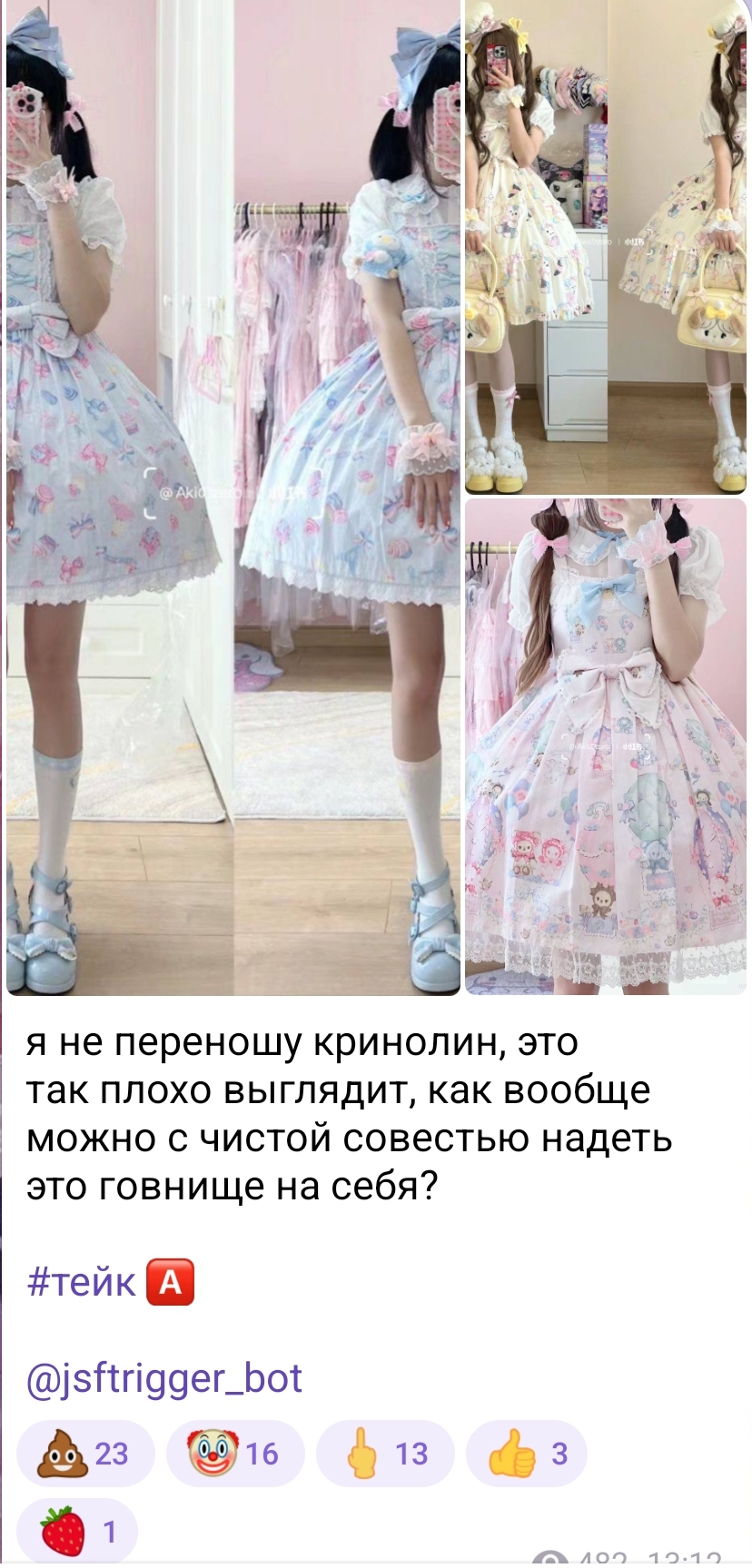 >>78201 Попросили не спамить фотками вне темы = затравили. Тру этика. У нее если не шибаюсь есть свой канал но скидывать свои фотки вне образа она предпочла в чат на 200 человек и обиделась когда ее попросили этого не делать Погладь платье - травля Надень подъюбник - травля Не скидывай рандомный 1000 фоток в чат для лолитных фоток - пиздец травля Фу токсичные лолиты, давайте их обсудим