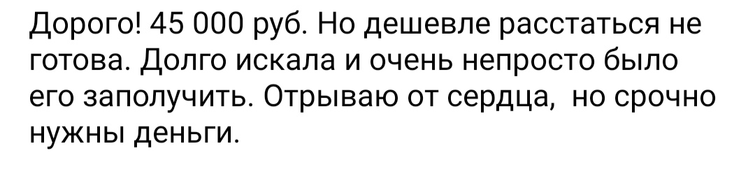 >>78277 а никого ебать не должно за сколько человек продает уже СВОЮ вещь реально смешно читать высеры на тему цен, это не мета, которая на 38 к подорожала