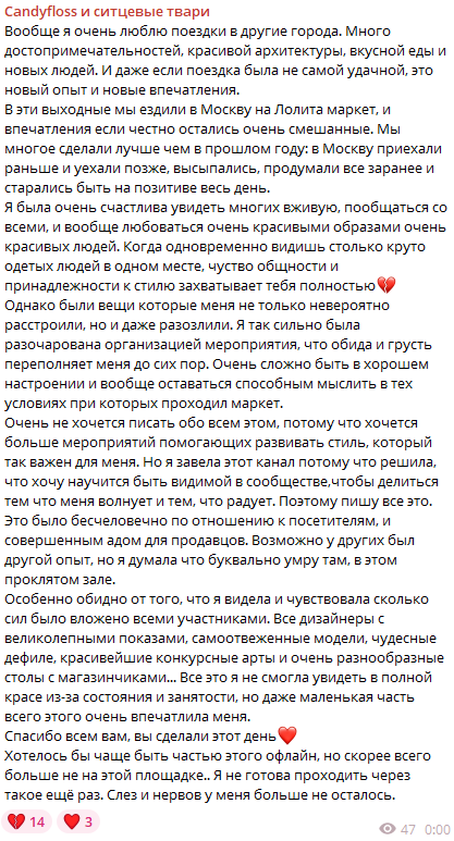 Аделаида когда-нибудь поймет, что прежде чем устраивать свистопляски с показами и прочей хуйней, стоит хотя бы обеспечить человеческие условия участникам с обеих сторон? Проходил ли хоть один маркет без давки и духоты? Лично на моей памяти нет. Пост из ТГ одной из владелиц Ламбов