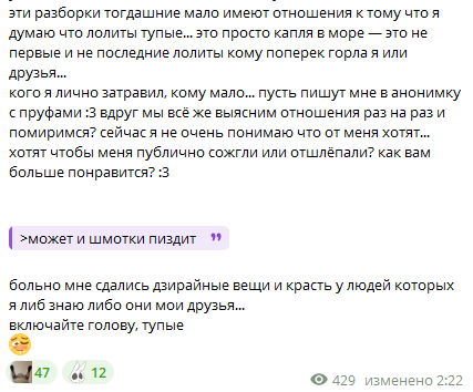 >>77726 Сиса, тут не соглашусь. Я сабж впервые заметила в сраче с Вафлей в твиттере(еще до вафлегейта): конкретно тейки не вспомню, но она обсирала бишоп, а Вафля и ко ей ожидаемо напихали хуев за щеку. Сначала подумала, что это просто неумелый тролль с пустым аккаунтом, но на аватарке было фото сабжа в лолите, а по юзернэйму нашлись и другие соцсетки. Круг общения у неё в самом деле из двачеров, причем что тогда был, что сейчас, и, если честно, тогда у меня тоже сложилось впечатление, что она употребляет.