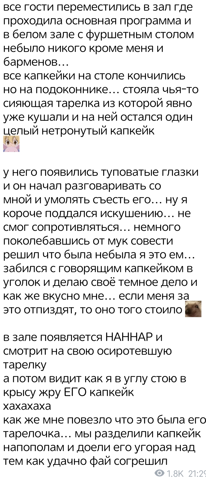 >>78026 Блять, я вообще проблемы не вижу. Это же изначально мероприятие от своих для своих, почему организаторы не могут поучаствовать в общем веселье, если им и так тяжелее всего приходится со всей мозгоеблей, за которую они ничего не получают. Они такие же члены сообщества, только еще и делают для других много делают на добровольных началах. Кто-то там еще в чате высирался про то, что типа работники должны быть тихими бесплотными тенями. Вообще выпала с этого захода. Как-то обидно быть человеком, который добровольно берет на себя кучу ответственности и обязанностей, чтобы остальным было весело и хорошо, и вместо благодарности — дискриминация в виде запрета участвовать