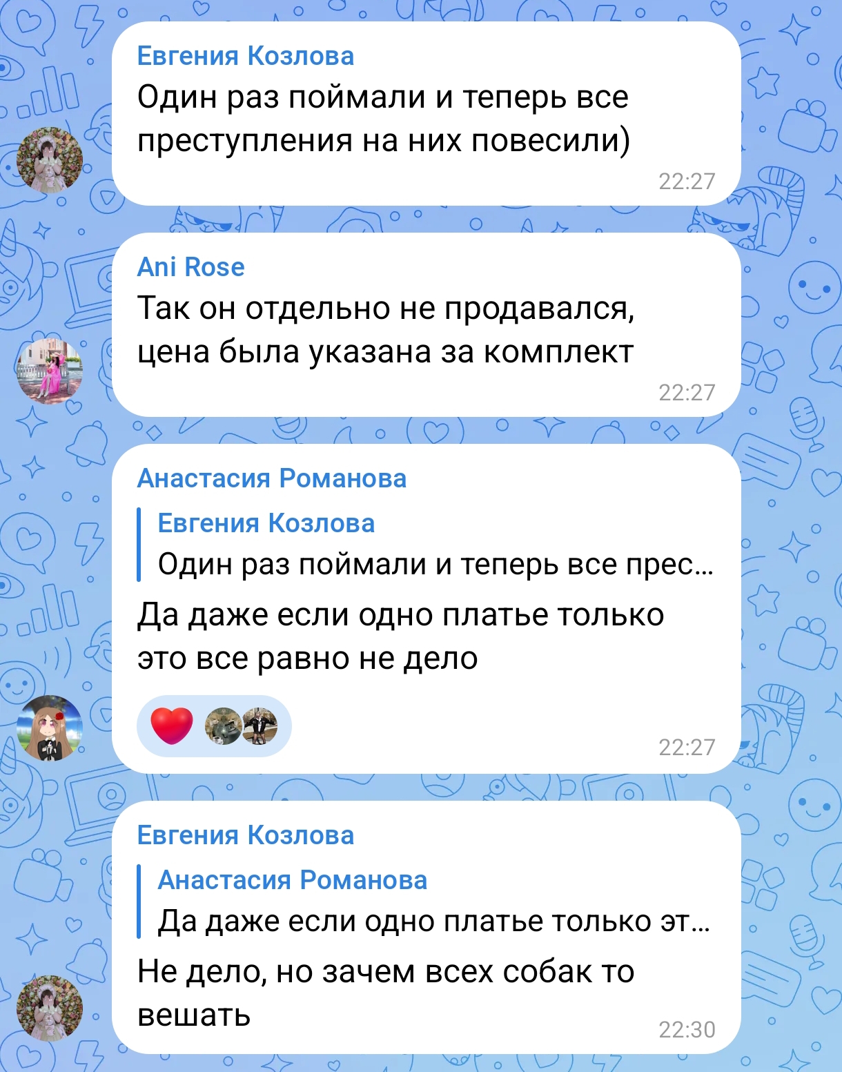 Когда всех отпустит бобик за 15к от аннет, ебать старые сраки разбубнились Ну не должно вас ебать кто за сколько денег продает свои вещи, никто не обязан продавать за такую же стоимость как сам купил, типа на мегаплей кто-то гнал из этих уебищ за клетчатое ап? нет, потому что бабонька заткнет их и опустит, а мари кловер с бобиком за 8 почему никто не хуесосит? ебать двойные стандары Отвалите от Аннет бля, если когда-то буду продавать бурандо, то буду ставить выше, чем купила, считаю так и надо, если это не расшитое и в говне платье