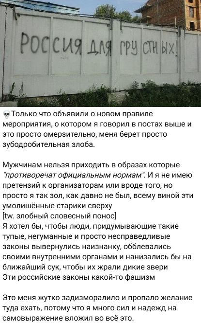 >>78112 Ну, тут, как верно подметил этот товарищ, дело даже не в оргах, а в наших законах и повесточке. Поэтому это правило будет на всех подобных мероприятиях, на глф в том числе, если он всë же будет 😆. Иначе, достаточно будет пары фоточек и звоночка от неравнодушного челика и оргам пизда