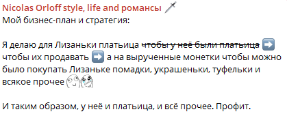 Чето на хаха пробило. Бренд вроде как совместный, сама Лиза, помимо основной работы, хуярит в нем без продыху, а Колька себя пяткой в грудь бьет со словами "Я КУПИЛЪ". Колян хоть и транс, а в присваивании женской работы преуспел ничуть не хуже обычного мужика.