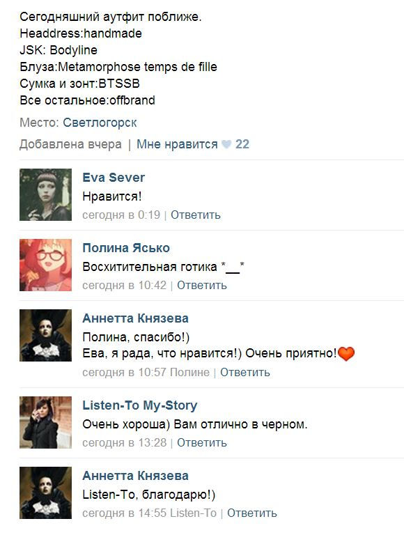О, мне ответили >Я не ношу капоры вообще. Фото было сделано для того, чтобы отфотографировать платье и аксессуары на человеке. >"Общий альбом русские лолиты", не "ваши творения" Ну вот, путаться начала :с Что-то мой Абубис сдает, надеюсь тупо пмс и скоро снова станет няшей >>12591-тян