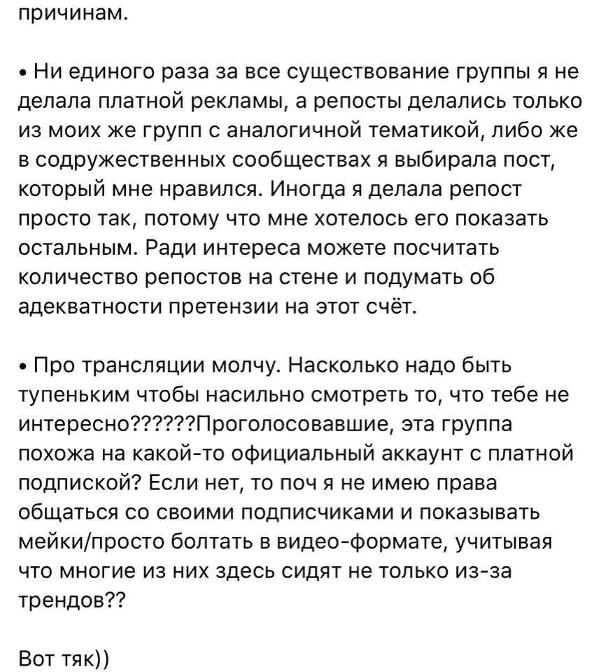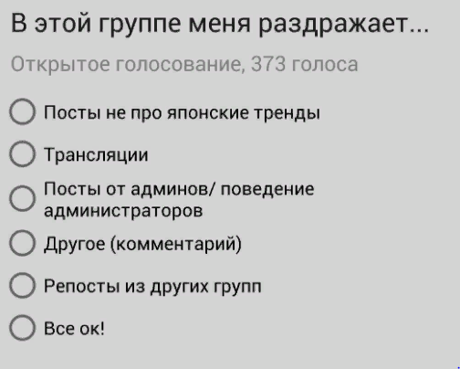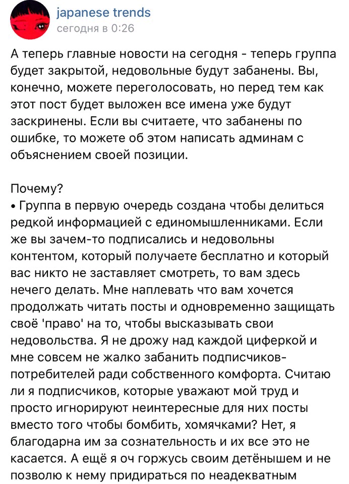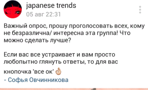 Хей, токиофешач, что думаете об этом? В japanese trends был опрос, под которым админ распиналась, как она хочет сделать контент лучше и как ей важно мнение подписчиков. А потом дала им хуем по губам и забанила всех голосовавших с аргументом "я настолько пиздата, что вы должны потреблять всё, что я делаю, и просить ещё".
