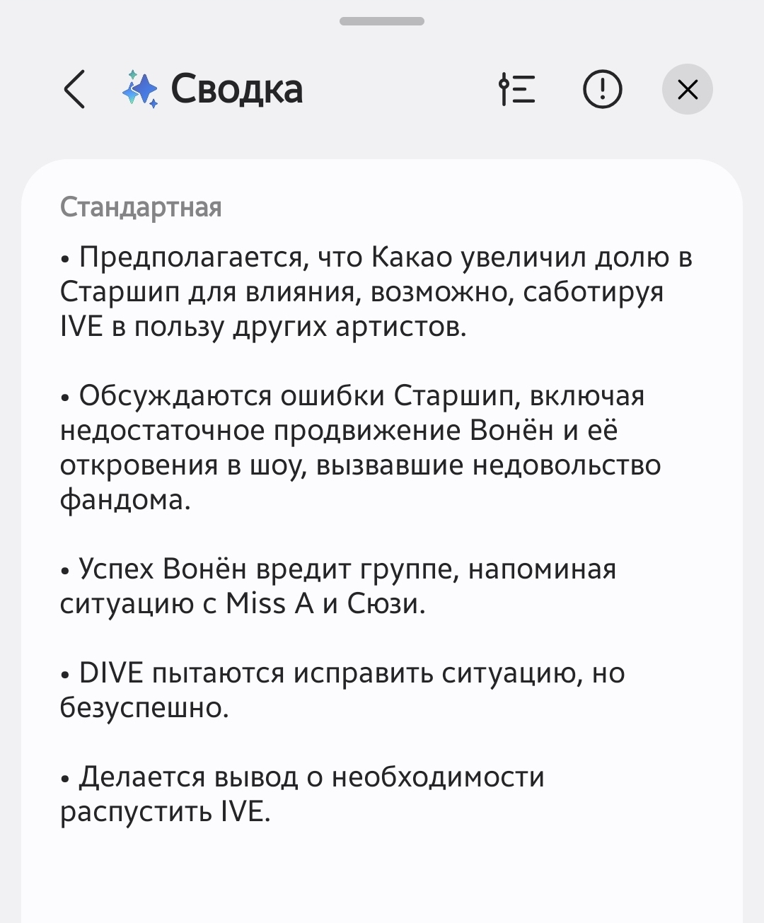 Примерно с конца весны 2023 они практически перестали продвигать Вонён. Всё что у неё было - групповая активность и мероприятия брендов, зато других участниц начали усиленно форсить через телешоу, личные ютубы, тиктоки и т.п., но ожидаемого результата не последовало (все вы знаете, что как раз со второй половины 2023 у них пошёл спад просмотров, лайков и прослушиваний, особенно на глобальном уровне), поэтому решили иногда показывать ЕЁ публике. Так вот, ключевой момент произошёл, когда она зимой пришла в то шоу Джесока и его друга, где недавно Билл Гейтс был. Без понятия, как Старшип это не проконтролировал, но она очень много всего наговорила, что пустило на них тень и намекала, что ей надоело быть в группе и что жаждет чего-то нового, во всяком случае люди это восприняли именно так. После этого, Нёнрандан(имя её фандома) всюду начали активную компанию по дискредитации Старшип, других участниц Айв, а также групп новичков, которые пришли на всё готовенькое и существуют за чужой счёт. Лично я в этом принимал участие. Каждую несправедливость, вроде всего двух охранников, 1мин экранного времени в 30мин видео или неудачного образа, мы возводили в абсолют, каждое новое появление в рекламе называли жадностью Старшип, каждое выступление (вроде 4 фанконцерта за 2 дня в каком-то ангаре и даже без подтанцовки) начало отзываться болью в сердцах, там где она появлялась одна углядывалось паразитирование на её славе, а значит это не помогало группе или компании, а наоборот только хуже им делало
