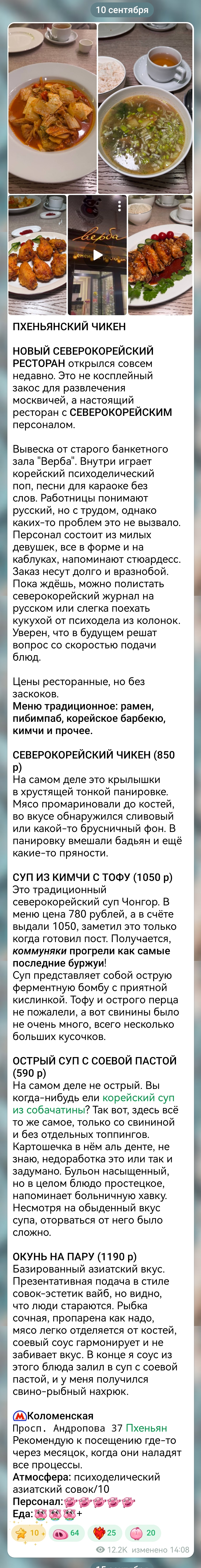 В Москве открылся северокорейский ресторан «Пхеньян», попасть в который можно только по паспорту. Вход запрещён и тем, кто когда-либо посещал Южную Корею. Внутри царит дух чучхе: на экранах транслируют передачи из КНДР, на столах лежат журналы из Пхеньяна, а плейлист сочетает северокорейскую поп-музыку с записью концерта Шамана для Ким Чен Ына. Персонал полностью набран из КНДР. Официантки — молодые женщины в униформе и на каблуках, похожие на стюардесс, с трудом понимают русский язык