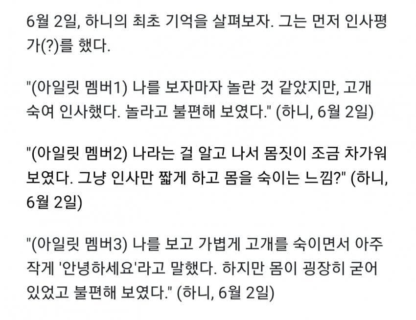 «(Участница Illit №3) слегка поклонилась и очень тихо сказала “здравствуйте”, но тело было весьма скованное и напряженное». (Ханни, 2 июня)