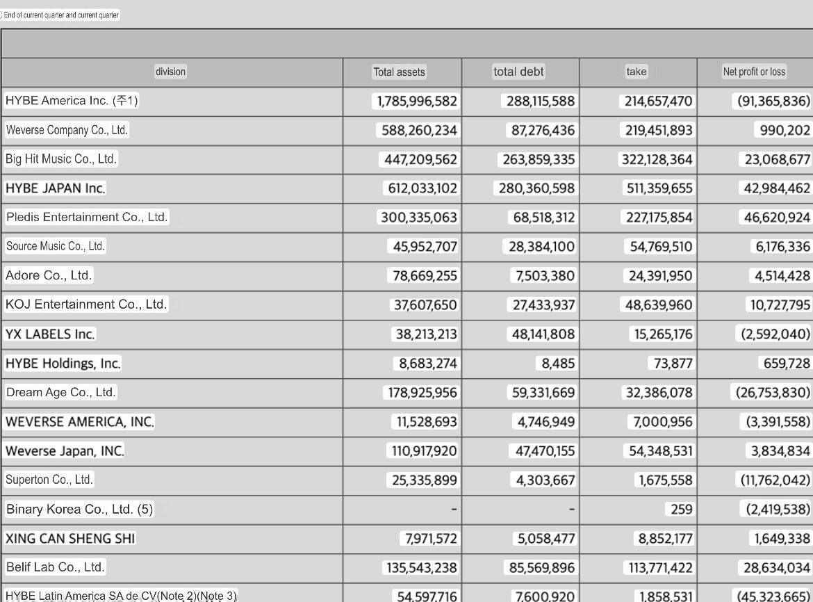 HYBE опубликовала финансовый отчёт за третий квартал 2025 года, включая показатели основных дочерних компаний: Big Hit Music, Pledis Entertainment, Source Music, ADOR, Belift Lab и KOZ.
