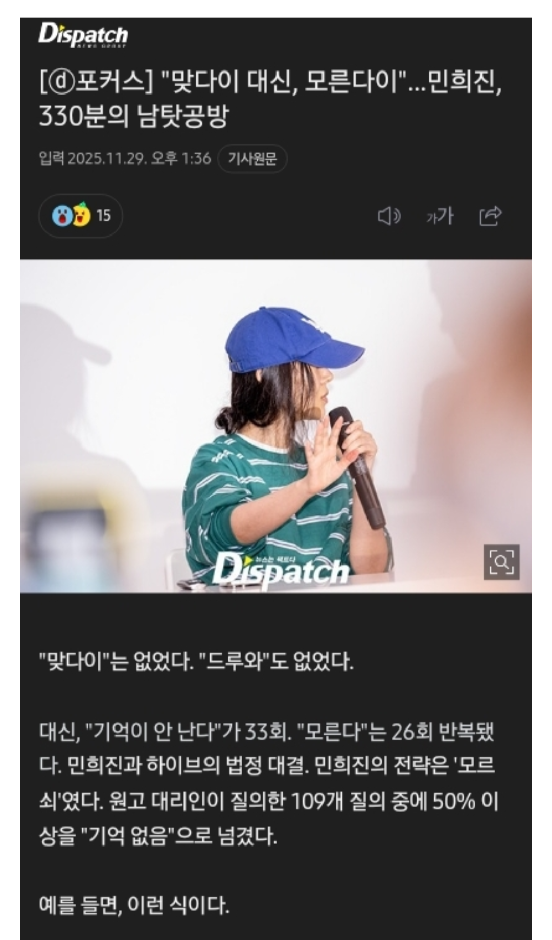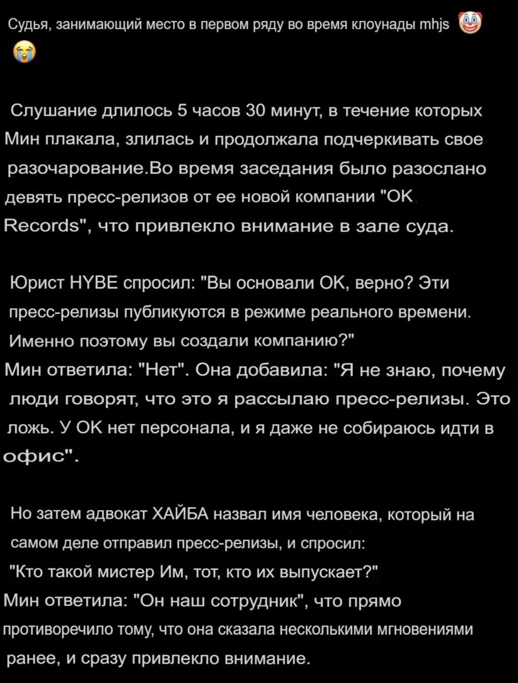 Все я понял, стратегия адвоката хайб задавать подобные вопросы Мин Хиджин, чтобы потом платить журналистам, дабы те уничтожали ее на инфополе. Никакого отношения к делу не имеют, но можно печатать кликбейтные заголовки.