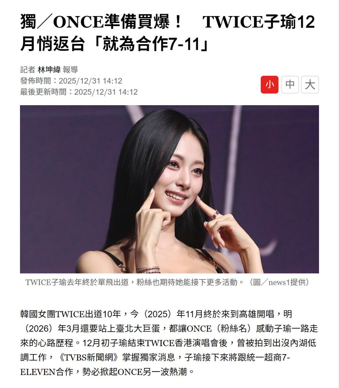 По сообщениям тайваньских СМИ, Цзыюй будет сотрудничать с сетью магазинов 7-ELEVEN. Её заметили на съёмках в студии, когда она тайно вернулась на Тайвань в начале декабря