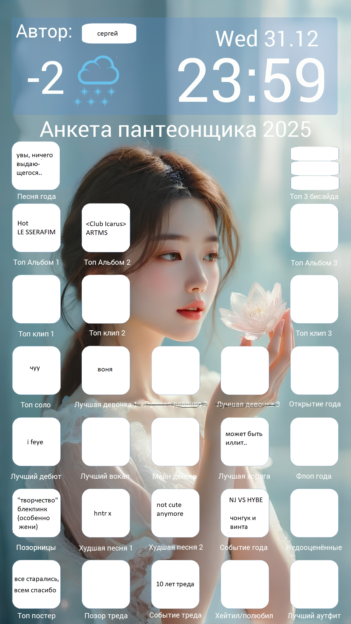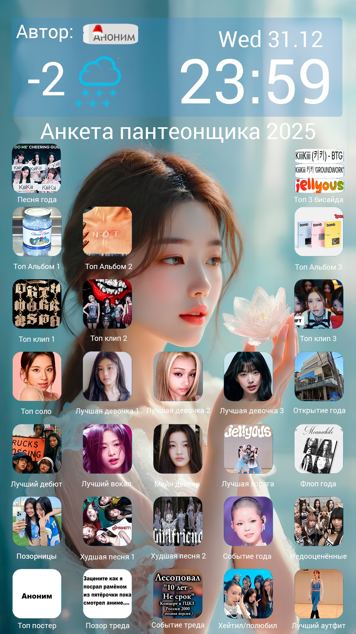 Это великий и единственный тред K-pop богинь в котором мы поклоняемся склоняя голову и любуемся их неземной красотой, встаем на их защиту не жалея собственной плоти. Да озарят они наш жизненный путь своей красотой, да воодушевят они своими голосами трудные наши пути, да даруют нам надежду своею любовь в темные дни, восславим безмерно наших богинь! Сидим под пледиком, пьем чаек и смотрит фанкамы уходящего года и новогодние ТикТоки богинь.