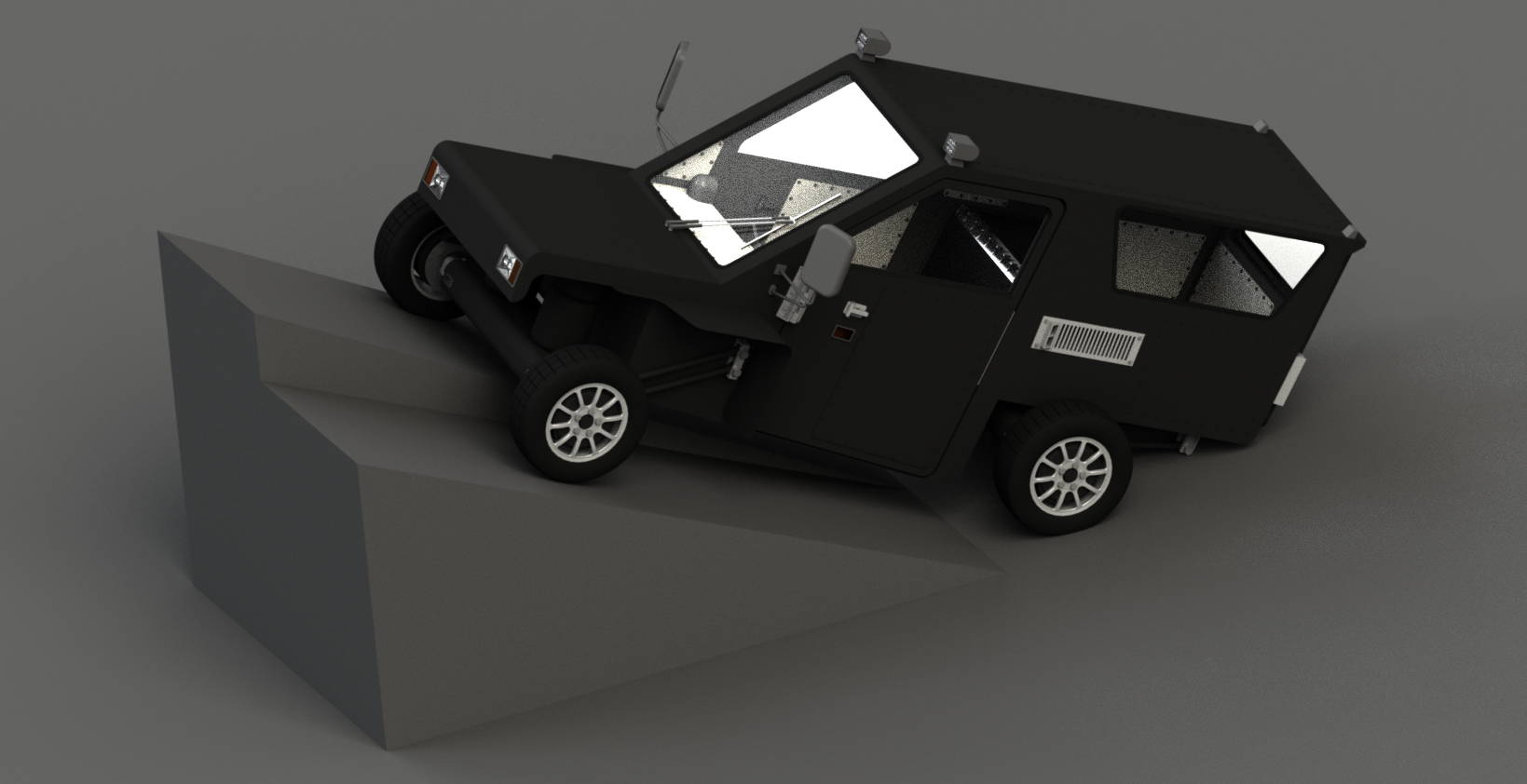 Силовая установка -- 12 кВт мотор-ступицы, полный привод. Маленький аккумулятор на 20 км и 15 кВт бензоген с бензобаком. Рулит шаговым электродвигателем.