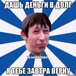 Я отказываюсь верить в том, что такие люди как ты существуют и доживают до сознательного возраста. Где логика в твоих действиях? Занимать 800 к, чтобы вернуть ссаные 87 человеку, который по горло погряз в долгах? Он не отдаст тебе ни копейки. Будет высасывать из тебя и подобных тебе терпил деньги, чтобы рассчитаться с теми, кто может его хлопнуть. А потом обанкротится и укатит в закат на несвоем шикарном автомобиле.