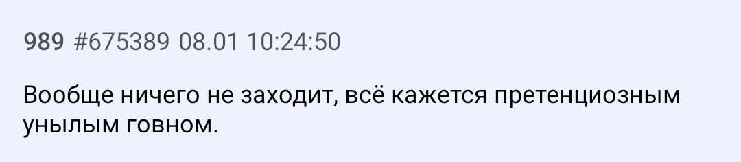 >>114343 >В чмаче мочух временно перестал тереть щитпост и чатики. Это я уже проходил на прошлогодних праздниках. Решил вернуться туда и вроде бы всё нормальное было какое-то время, а потом началось. Нет. Чмач закрыт для меня навсегда. >>114344 Ну сегодня ещё можно попробовать и здесь. >>114345 Ты блатной просто.