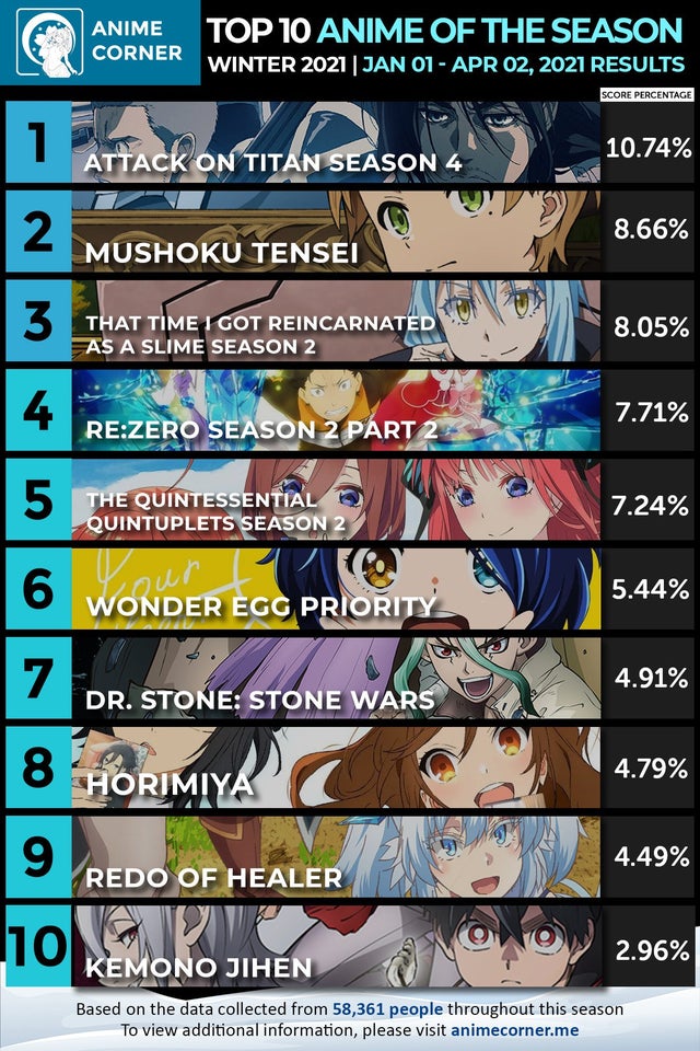 Hanyou no Yashahime - неудачная попытка выехать на родителях. Интересными были лишь те серии, где показывали прошлых мейн героев и время до рождения детей, в остальном же - эээх. Скучные враги, скучные промежуточные сюжеты. Но Сещёмару всё такой же ахуенный - это да, это у него не отнять. Ладно, ждём некст сезон. 5/10 Jujutsu Kaisen - не знаю почему я вообще начал смотреть этот типичный батлсенен, ведь не особо любитель такого. Ничего впечатляющего, единственное отличие от всей остальной массы похожих тайтлов - качество поделия. Тут вообще вопросов нет к технической части, она на высоте. Сюжет же никаких эмоций не вызывал. 5/10 Shingeki no Kyojin: The Final Season - лучший сезон из существующих. Мурашки по коже, восторг от каждой серии, рост героев в моральном и не только плане. CGi титаны вообще не мозолили глаза и органично вписывались в остальной графон, крутые чардизы. Маппа разъебала, так сказать. 8/10 Vlad Love - так-так-так, что тут у нас? Осии? Вроде ник известный. Что делал? Гитс, которому я 5/10 поставил? Похуй, глянем это поделие... оказавшееся открытием сезона! Вот уж не ожидал так не ожидал. Аттракцион, а не аниме. Жанр типа ФЛЦЛа - вообще не понятно что, но очень круто. Песни из опенингов и ендинга на репите. 8/10 Mushoku Tensei: Isekai Ittara Honki Dasu - здоровский исекай, какой более взрослый, чем остальные, чтоле. Гг апгрейдится, доджит ошибки, которые совершал в прошлой жизни и всячески показывает, что он вполне даже обучаем. Первый кур сезона показал, что мир Мушоку Тенсея огромен и им в будущем придётся это всё показать и объяснить. Интересно - пиздец. Алсо, понравился постоянный эффект чуть трясущейся камеры, как в кино. Да и анимация в целом пиздата. 8/10 Ura Sekai Picnic - начали за здравие. Зона! аномалии! артефакты! болты! нехи!, но по атмосфере ну совсем что-то плохо. Да, мифы из японских интернетов прикольные, но как-то не зашло. Я уж не буду говорить о том, что меня обманули с юри и ничего такого там не было, хер с ним. 6/10 Re:Zero kara Hajimeru Isekai Seikatsu 2nd Season Part 2 - резира держит планку первой части второго сезона, не лучше и не хуже. Раскрыли прошлое Эмилии и другой кучи мейн персонажей. Здорово! 7/10 Yakusoku no Neverland 2 - разочарование зимы. Весь саспенс и ужас первого сезона смыли в унитаз. Вывалили какую-то хуйню типа мир-дружба-жвачка, враги уже не враги, месть уже не месть. Тьфу. 4/10 Jaku-Chara Tomozaki-kun - обычный такой проходняк про вылезатора. Ну хоть романтика не типичной оказалась. 5/10 Wonder Egg Priority - не хочу ничего говорить о яичке до выхода ласт серии, но по тому, что есть - вполне можно судить. Проблемы современных школьниц, какие-то самокопания, неплохие экшн-сцены и визуал вышли во вполне неплохую картину. Аниме часто сравнивают с Мадокой, но мне оно больше напоминает Флипфлаперсов. Минимум 8/10, может быть из-за летней серии накину балл, если совсем что-то суперкрутое будет. Kaifuku Jutsushi no Yarinaoshi - ОООООО Да! Это то, что я искал! Вне сомнения лучший тайтл сезона. Произведение, где месть от слова МСТИТЬ, а не от слова "ъэъэъэ ну вот я нашёл тебя, своего врага, но мстить я не буду, потому как окажусь хуже, чем ты, и давай вообще подружимся и выпьем чаю". Здесь чел знает свою месть, знает своё дело, и делает его на отлично. Жду вторую часть, так как мстя ещё не до конца свершилась. 4/10 Non Non Biyori: Nonstop - всё те же Биёри, всё те же девочки, всё та же глухомань. Но этот сезон вышел выше всяких похвал. 8/10 Horimiya - хуйня сезона. А что я вообще ожидал от тайтла, мангу которого я д