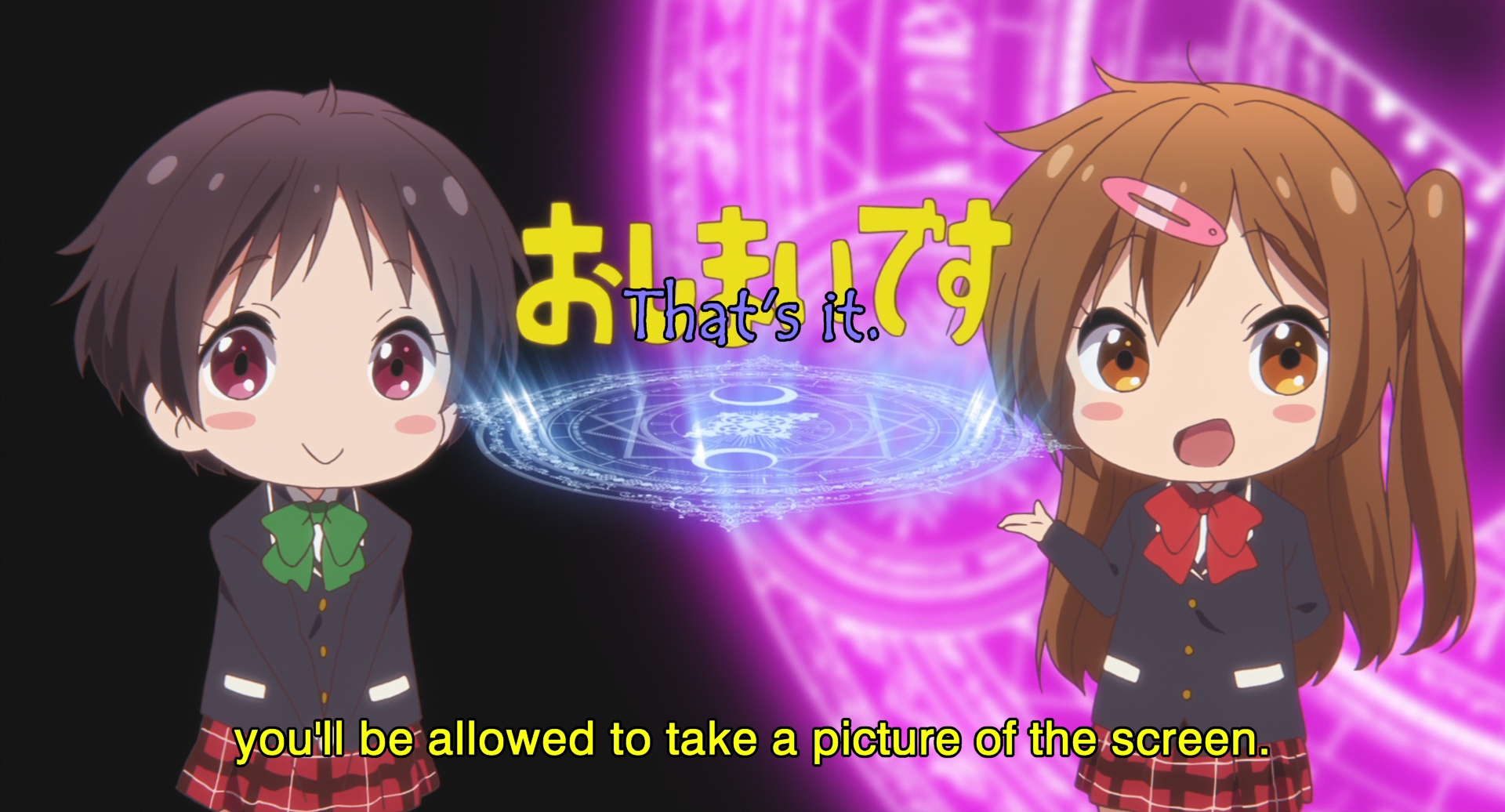 Алсо, это последний тайтл перед Лаки старом. Скипаю фри, тсуруне, фильмы-компиляции, рекламу и какие-то 24 одноминутных эпизода чунибья из твиттера, которые были в преддверии фильма.