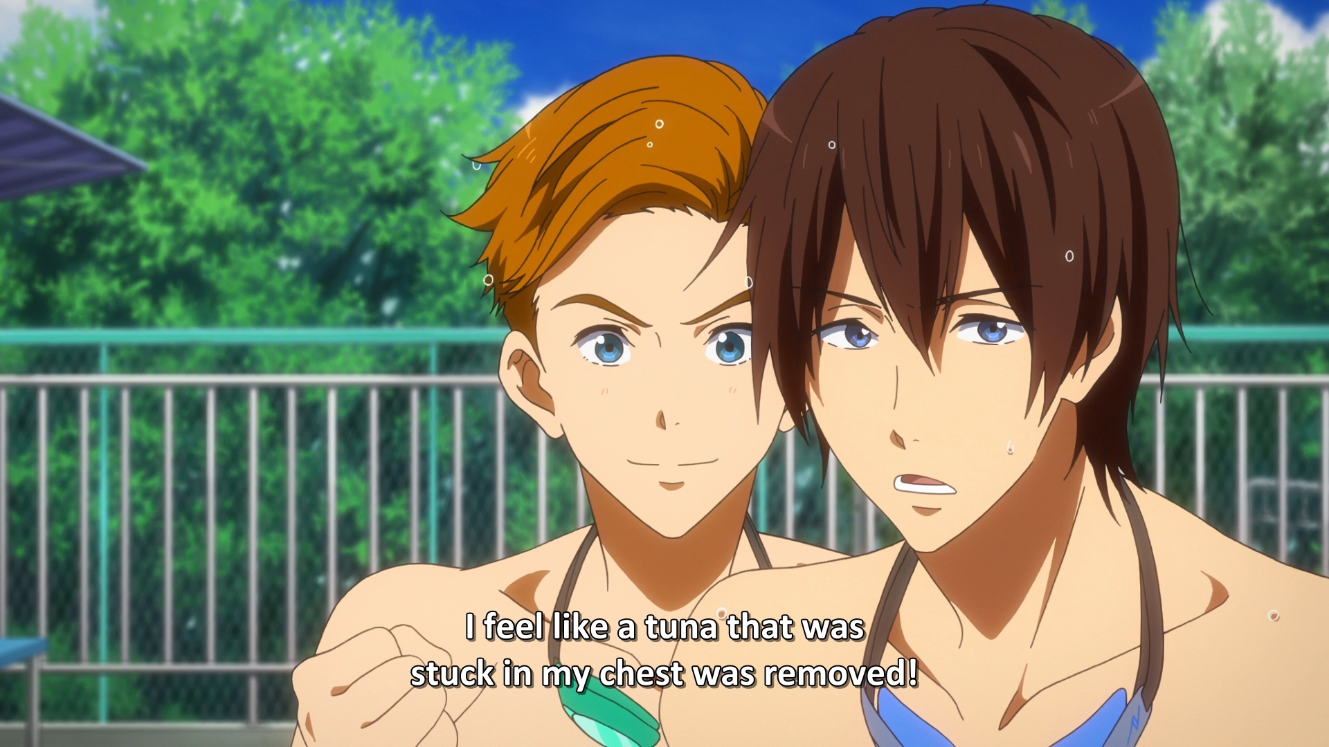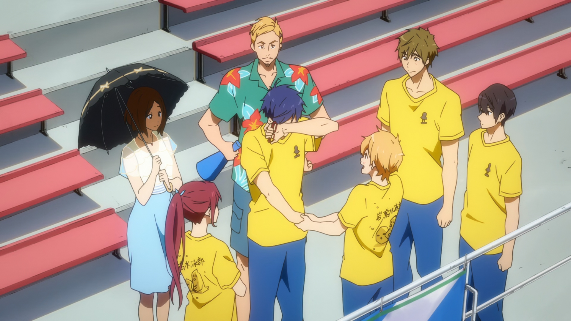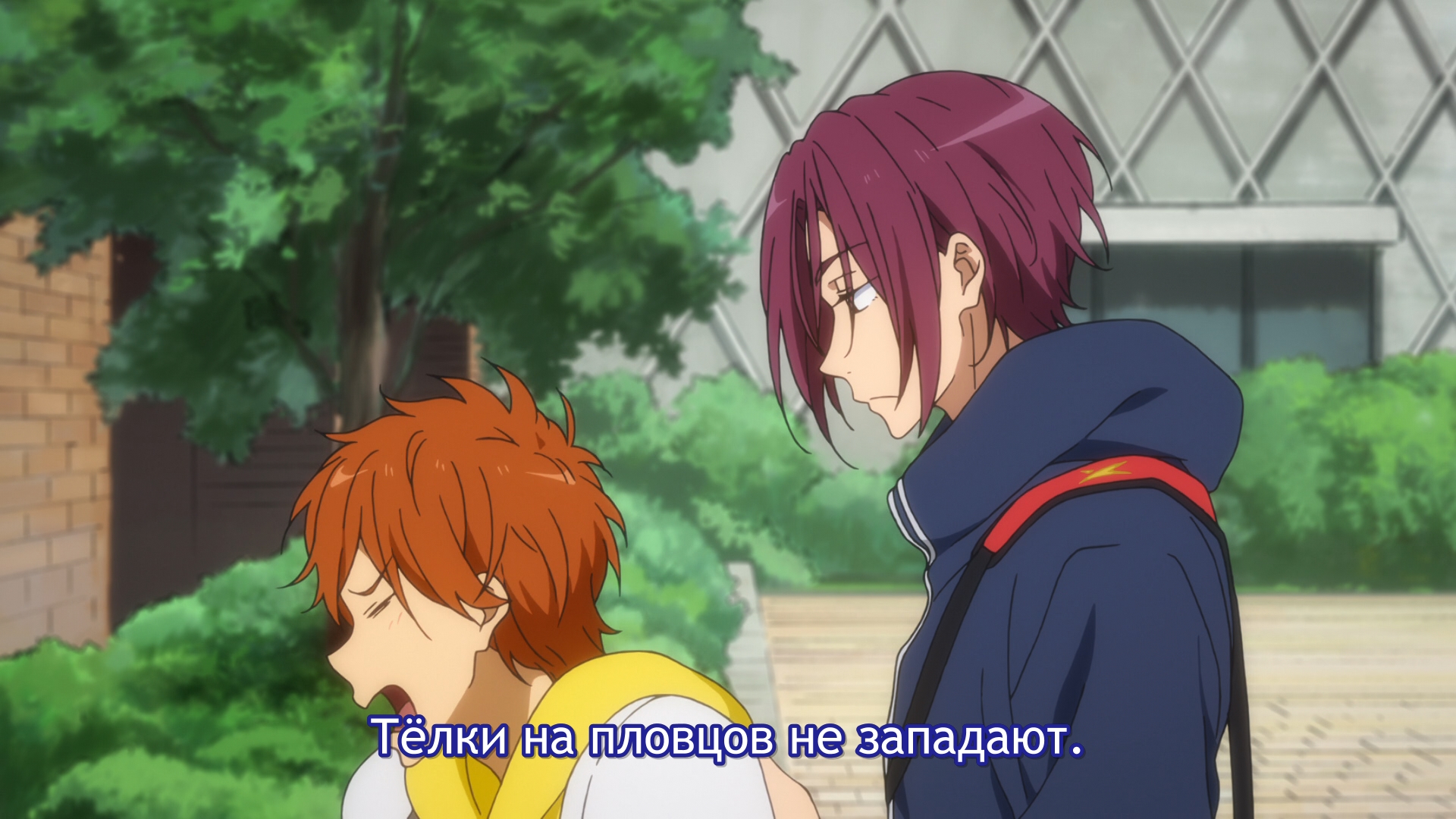 Фри - клишированный конвеерный проходняк. У пацанов даже какого-то особого характера или архетипа нет - всё шаблонное. Построение сюжета дефолтное аля: детишки раньше были тимой, подросли; один из них съебался куда-то там, перед этим не забыв навести драму(офк высосанную из пальца) с другим челом, потом вернулся и теперь будет соревноваться против своих старых друзей, но уже в другой команде. Затем эти два чела мирятся и улаживают старые распри, дружбамагия. Всё это уже видел под другими обложками. Второй сезон уже разнообразнее, но тоже ничего интересного. Разве что предпоследняя серия в Сиднее была неплоха. Жирухо-фансервис не особо мешал. Даже местами было забавно, когда слишком сильно и пафосно акцентировали внимание на мускулах, прессе и тд. В голос проигрывал. Но это было только в первой половине первого сезона, потом уже от этого отказались, и правильно сделали.