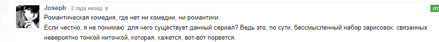 Надеюсь, это правда. А то за 5 серий отношения трёх действующих лиц не продвинулись ни на йоту. Они даже ни одного слова толком друг другу так и не сказали, только бегают-прыгают, всякую хуйню бесполезную вытворяют, а в чувствах ни один признаться не в состоянии. Вот уж действительно - ромКОМ.
