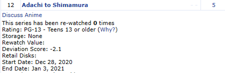Ежедневный обмен слюнями закончился и что-то мне даже сказать нечего. Кроме поцелуев ничем больше не удивили, развития отношений ни у главной пары, ни у второстепенных не было, всё просто шло по прямой линии и без нервов. Простенький слайс юринях. Единственное, что после просмотра я пошёл и изменил оценку Адачи и Шимамуре на 6, а Сакура трику 5 поставил, потому как и то и то - романтический юрислайс, но первый хоть интересен был из-за постоянных подёргиваний моих нервишек, а в сакуре ничего такого не было и поцелуи уже после третьей серии немного наскучили и никак не воспринимались, пусть и были местами шишкоподнимательными.