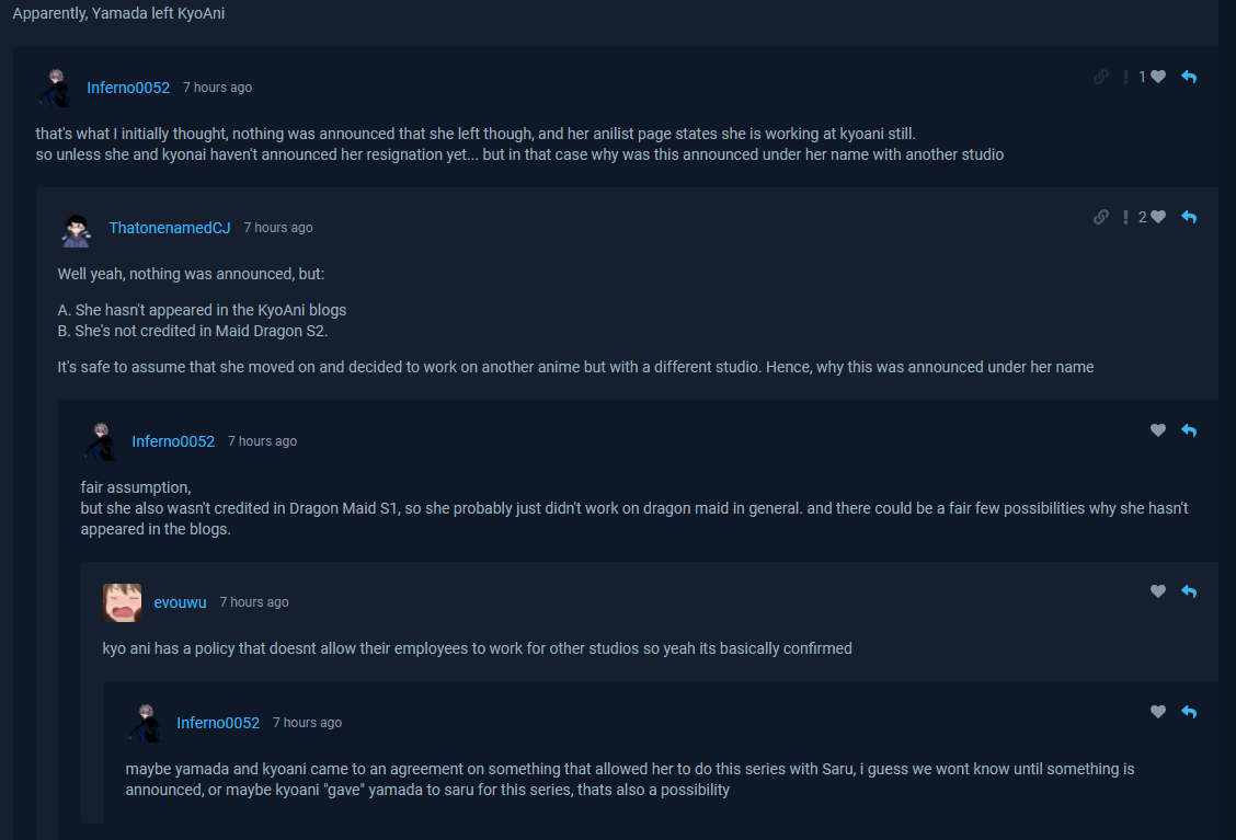 А, стойте, так Ямада не просто так по-дружески решила с юасой поработать - она натурально съебала с киани? Ну все, теперь там не осталось ни одного хорошего директора. Наверняка еще и часть людей с собой перетащит(вряд-ли будет делать это агрессивно, т.к. как я понимаю там скандалов небыло, но все-же кто то за ней уйдет, полюбому). Я у них мог смотреть только ее тайтлы и Такемото, все прочее было весьма, все остальное оставляло ощущение разочарования и бессмысленной траты ресурсов и талантов.