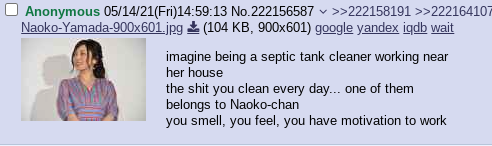 >>134858 Ну да, причем как я уже сказал выше - когда уходит такая фигура как она - эффект от этого обычно куда более серьезный, чем просто ее собственный талант. >>134860 Ну это не правда. Да, на форчане хватает дегенератов, но там есть и весьма интересные и сведущие аноны. Скажем так - в текущем нашем чмаче практически невозможно найти собеседника для какой-то серьезной темы, а там вполне. И кстати, общение на форчановском /a в целом куда менее токсично. В чмаче все только и делают что хуесосят друг-друга, а там есть несколько раковых тредов и групп(к сожалению фанаты киани одни из них), но в целом даже при несовпадении мнений беседа редко перетекает в откровенные взаимные оскорбления.