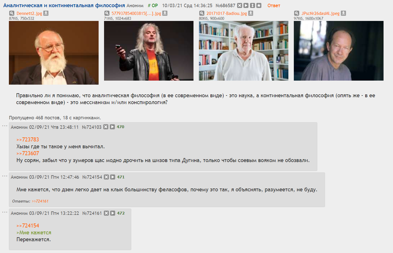 >>134868 >Зашёл сейчас посмотреть, что там - ну да, 85% нулевой по-прежнему обезьянничание, "что читают тянки тред" и единственное, что хотя бы нормально можно воспринимать - именные треды русскоязычных авторов. Зашел в lit, шитпостинг почти везде, протекший пол, и прочие прелести. По мне уж букач лучше, не говоря о философаче. Там ходя бы есть реквест/реакт тред, чтобы не засорять каждым пуком нулевую. Ах да, гринтекстодауны хоть и присутствуют, но в меньшем количестве. >В целом большая часть "нового" контента и сленга нынешнего харкача наследуется с форчана. Ну да, так и есть. Но делает ли это форч лучше? Ради рекомендаций чего-то нового может быть. >Тут почти всё вторично, Я уж лучше почитаю местные вторичные дискуссии, чем одноклеточные перепукивания с форча, которые после 5-10 реплаев тонут. Там бывали годные треды, но не так часто.