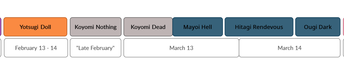 >>138818 Ну 14 февраля это цукимоногатари - там Хитаги засунула ему в рот шоколадку и пригвоздила к полу, а 14 марта это "Хитаги Рандеву" в овари II - я даже забыл, что это было на белый день - опять она все организовывала.
