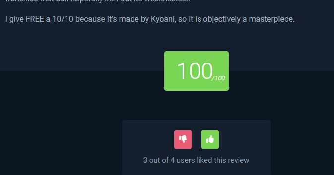 >>140965 Оч круто. Почти всё понравилось. Постапок фентезя в таймскипе на пару столетий очень прикольная. Мало где такое встречал, хоть я и мало иссекаев посмотрел, чтобы судить. Открытое противостояние богов тоже прикольное. Это получается, что каждый из них может себе вербовать сколько хочешь адептов и заключать с ними контракты и тем самым устанавливать зоны влияния. Вообще ништяк. Ну и каст с няшными мальчиками понравился :з Мне он даже показался странным. Обычно понапихают в ГГшный гарем женерик баб и ходит он потом с ними до конца тайтла как еблан. Ещё жду Арагорна из эндинга, лол. Отсыл очка на Гендальфа уже была, значит и этому мечнику могут похожий лор прописать. Имбовость ГГ разве что не особо прикалывает, но это видимо общая болячка жанра. Хотя, если бы он откис от первого встречного скелета, то это было бы тоже не очень круто.