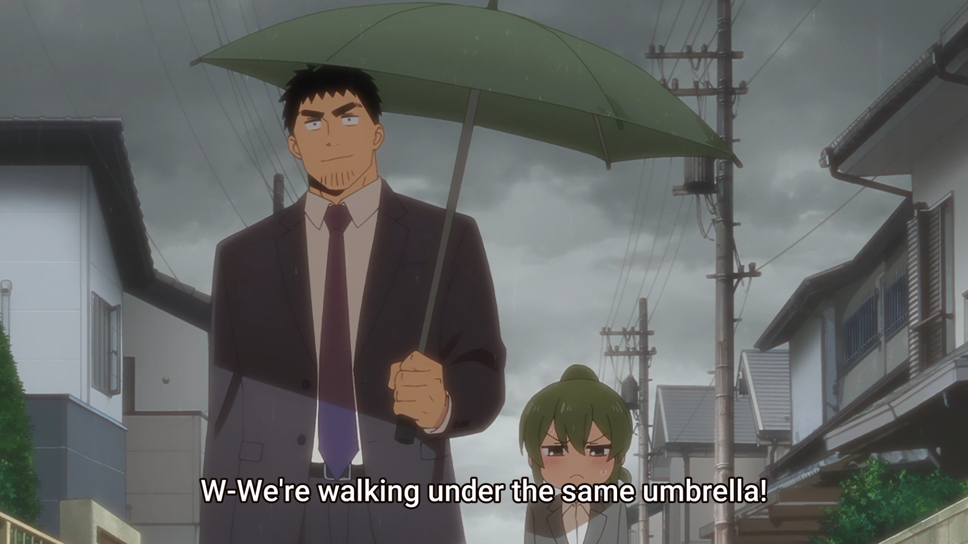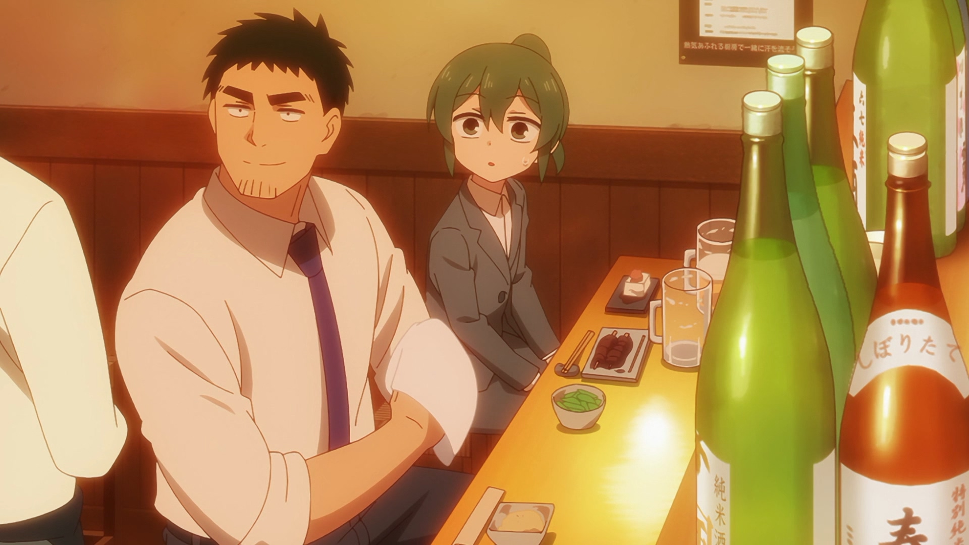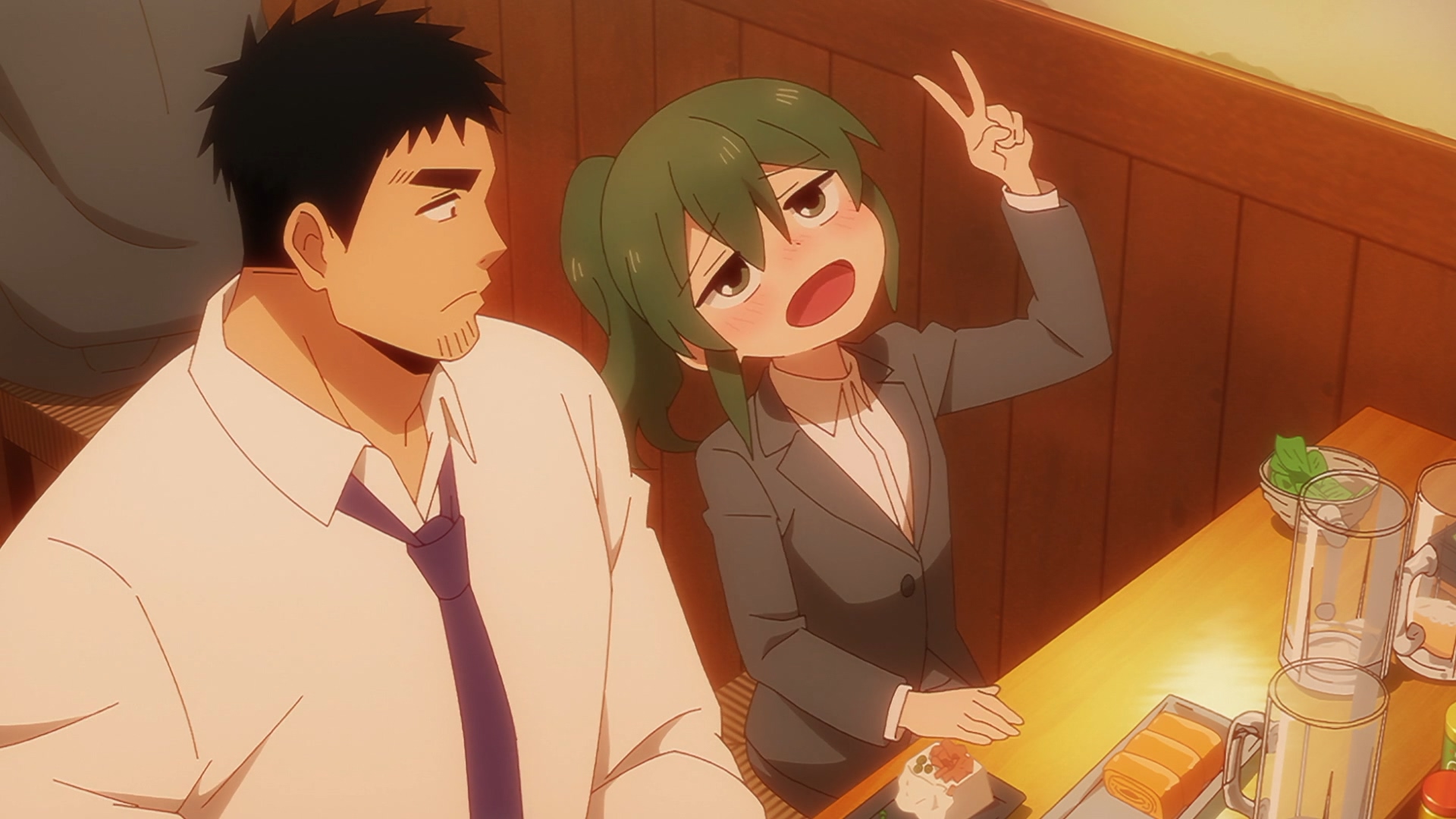Я немного удивился и был заинтригован, когда уже в первом эпизоде главная героиня не просто вполне осознавала свои чувства к семпаю, а даже спьяну ляпнула что-то про свадьбу - я то думал(исходя из названия), что они начнут издалека, постепенно демонстрируя прогресс - ну т.е. примерно с того флешбека, который нам показали в финале. Но такой резкий старт в итоге ни во что не развился и финальный эпизод, поместивший центральную пару за стойку того же бара, что и в первом - как бы предлагая подвести итоги, лишь подчеркнул, что ничего за эти 12 серий не произошло. Похоже автор просто придумал забавный концепт про отношения коллег - великана и милого зеленого гремлина, но не придумал что с ним делать дальше - распространенное явление, many such cases. В итоге свободное пространство наполнялось второстепенными персонажами, причем второстепенная пара получила чуть ли не большее внимание и показала лучший прогресс, чем основная. Я понимаю, что у автора наверняка ни офисного опыта, ни романтического - ну хотя бы посмотрел бы, не знаю, дорамы для референса. Или "Офис". Так что, как я уже говорил, получился средненький школьный ромком в офисных декорациях - непрямые поцелуи, смущенные прогулки под одним зонтом... очень не хватало культурного фестиваля! Анимация неплохая, ну и в целом ничего раздражающего. 5/10