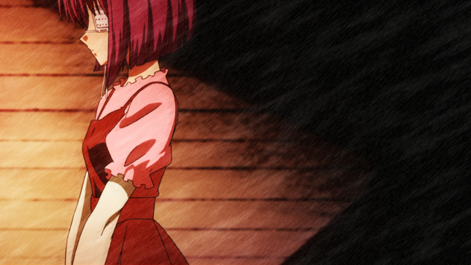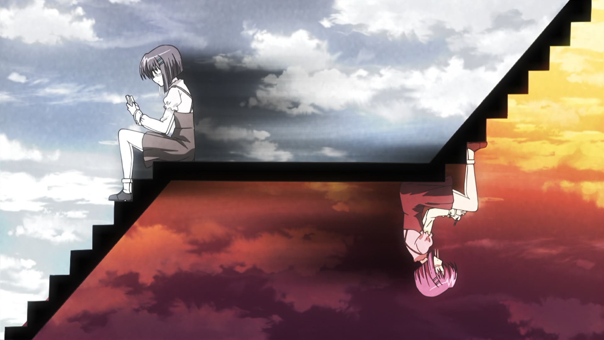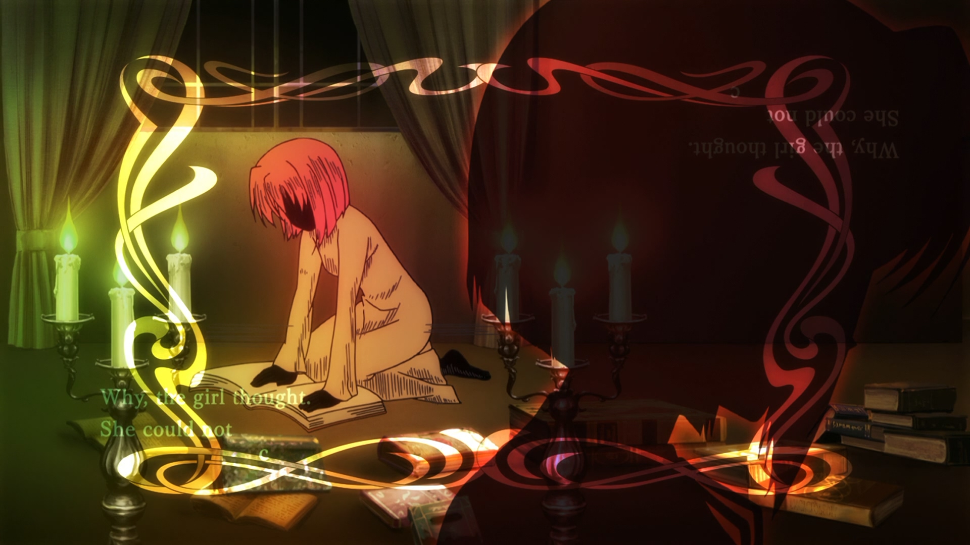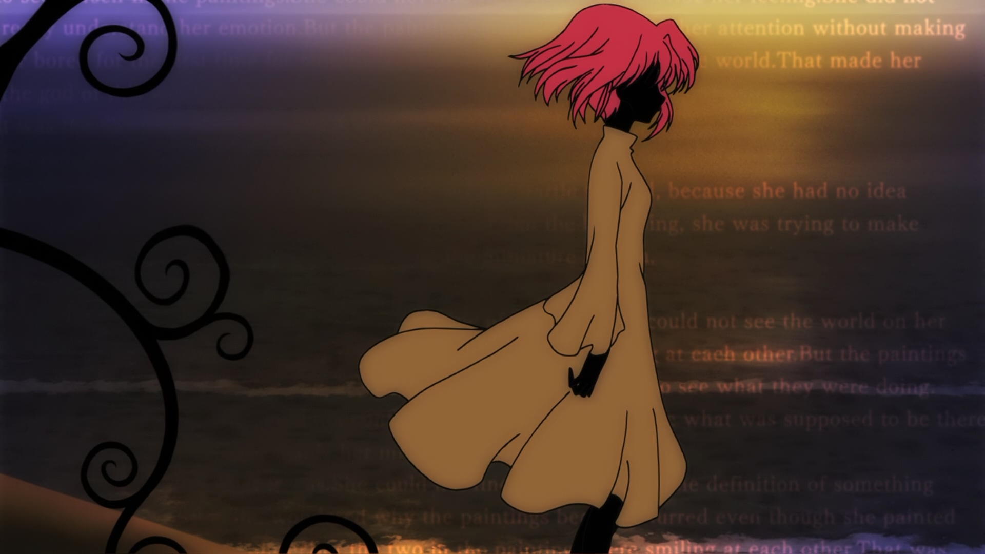 Кстати, эф это отличный пример не просто того как нужно делать "show, don't tell", а для чего и когда. Скажем вот >>143659 - тут на 3 и 4 пиках нам уже в первом эпизоде показывается суть, "скелет" отношений Мияко и Хиро(со стороны Мияко) - девочка, в которой отчаянная необходимость любить и быть любимой борется со страхом снова все потерять, находит мальчика в глазах которого может отражаться. Потом на этот скелет нарастет мясо подробностей, ближе к финалу мы узнаем ее бэкстори, контекст, но суть вот она - в двух кадрах. И то же самое с Хиро: с первых серий нам показывают его в моменты внутреннего монолога монохромным, мир для него бесцветен, но со временем в обществе Мияко цвета начинают появляться - сперва он сам, а затем и мир вокруг него начинает играть красками - и все, все понятно. Уже нет вопроса "хорошая ли они пара, подходят ли другу другу", нет смысла во всяких спорах о лучших девочках и т.п. При этом на данном этапе рассказать о чувствах еще некому - даже сам герой еще для себя не сформулировал их, не облек в слова, так что даже внутренним монологом их не зачитать. Их можно только показать. И подобных примеров тут просто навалом.